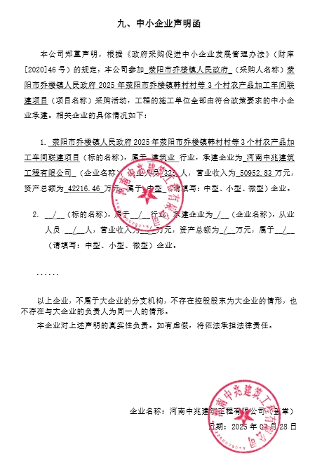 荥阳市乔楼镇人民政府2025年荥阳市乔楼镇韩村村等3个村农产品加工车间联建项目-成交公告