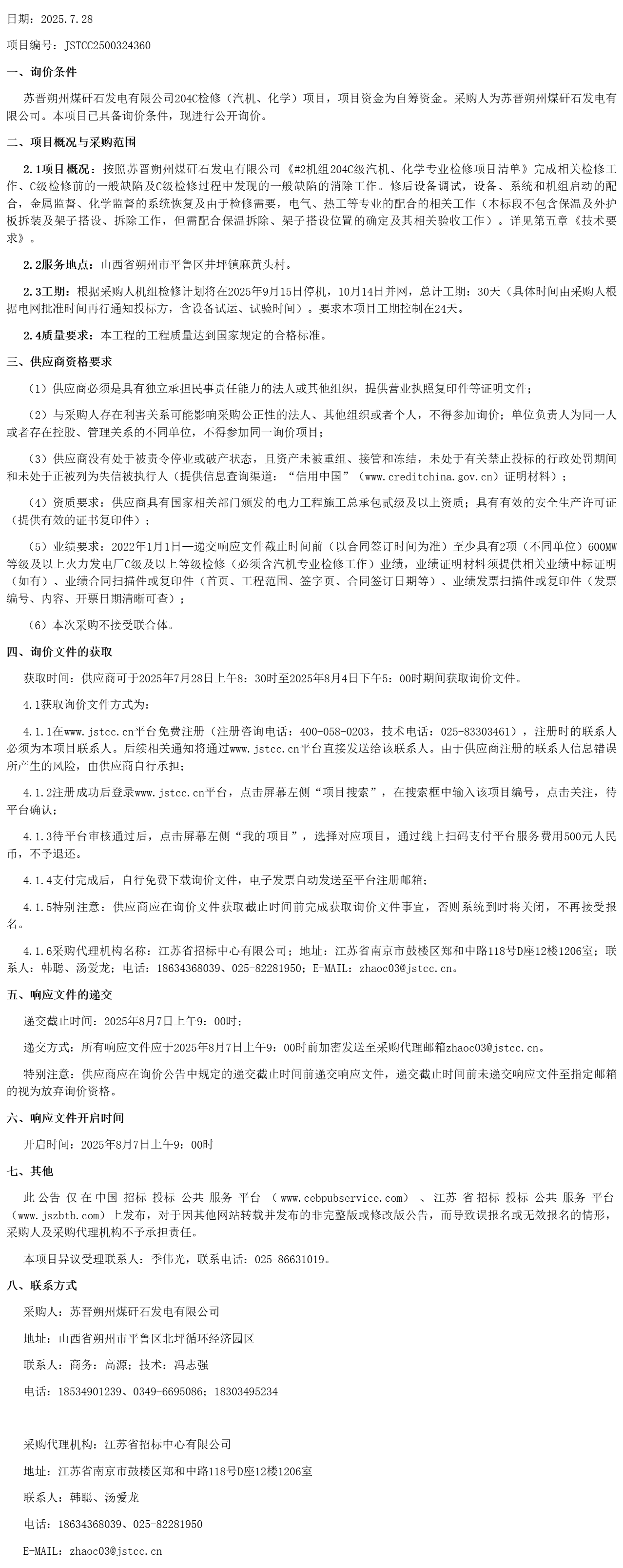苏晋朔州煤矸石发电有限公司****检修(汽机、化学)项目询价公告(***************)