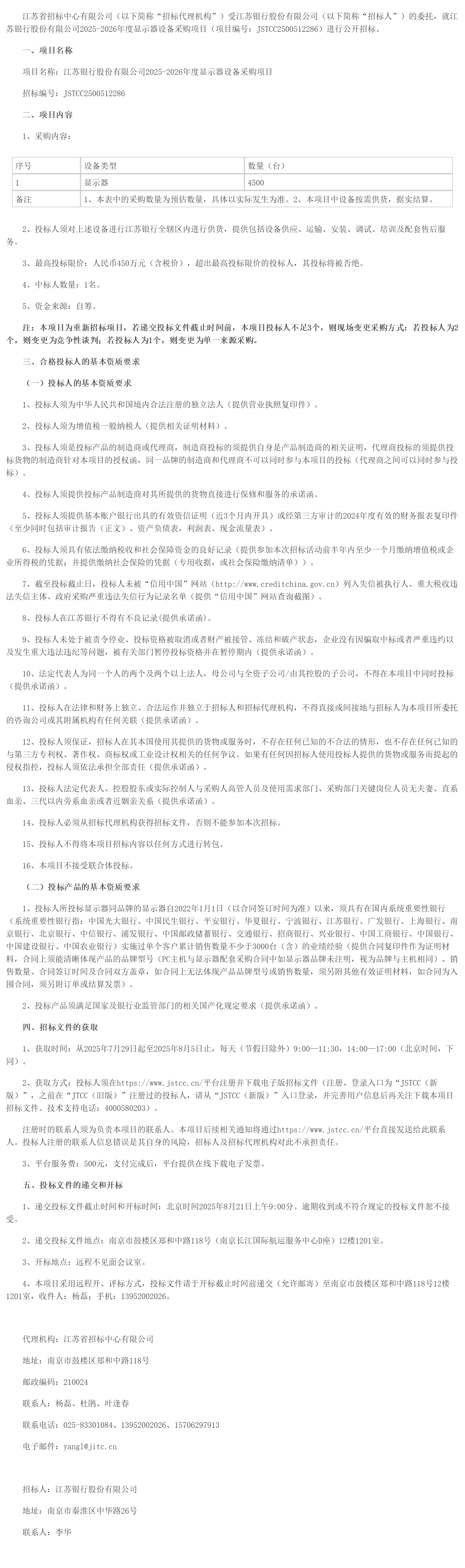 江苏省招标中心有限公司(以下简称“招标代理机构”)受江苏银行股份有限公司(以下简称“招标人”)的委托,就江苏银行股份有限公司*********年度显示器设备采购项目(项目编号:***************)进行公开招标。