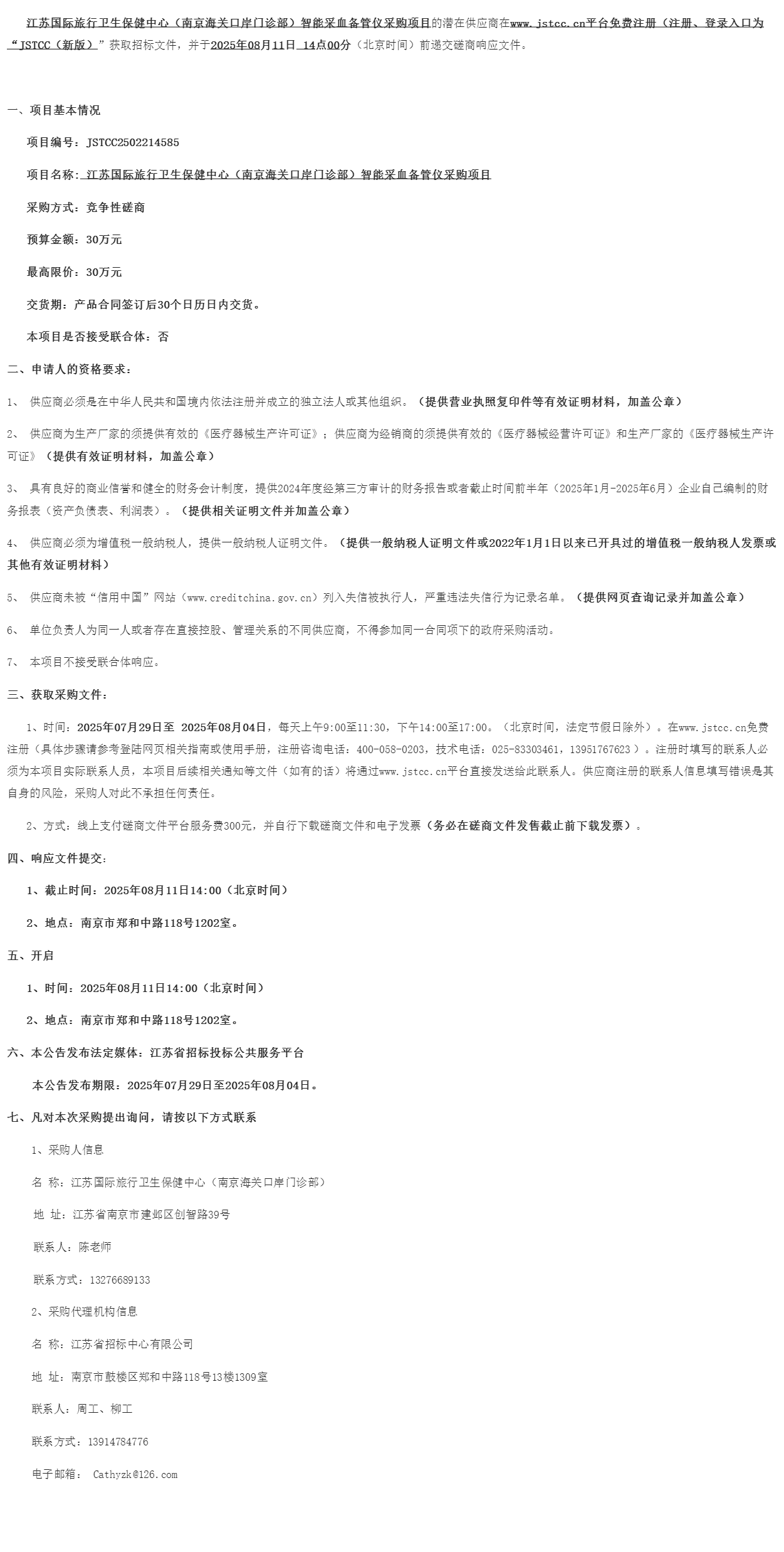 江苏国际旅行卫生保健中心(南京海关口岸门诊部)智能采血备管仪采购项目竞争性磋商公告