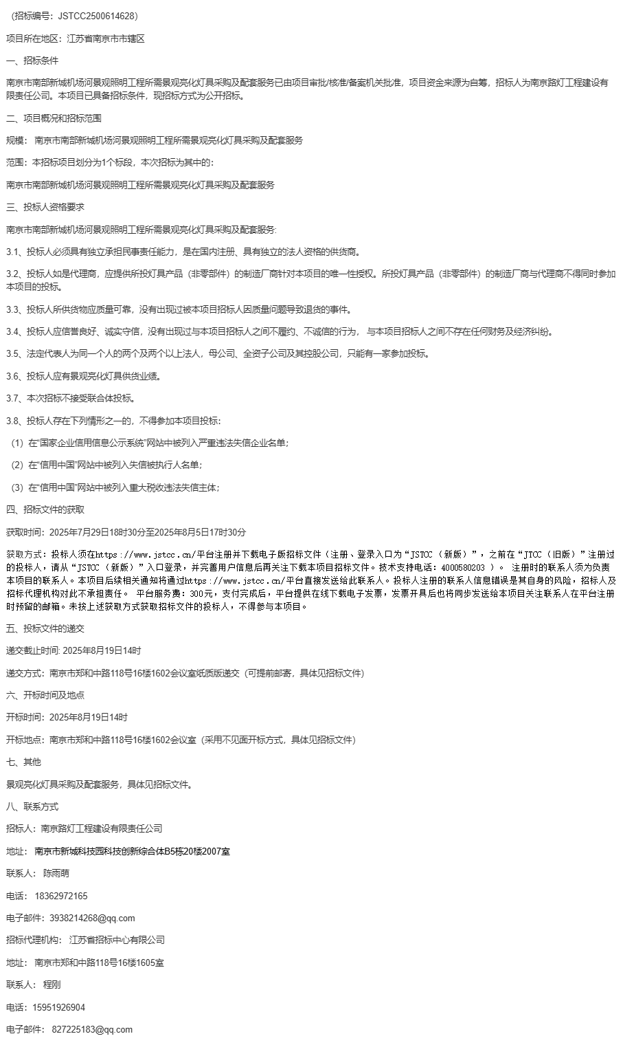 南京市南部新城机场河景观照明工程所需景观亮化灯具采购及配套服务招标公告