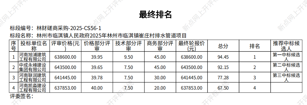 | 第一成交候选供应商河南旭浦建筑工程有限公司,价格**.**分,技术评审*.**分 ,商务评审**.**分,总分**.**分。 第二成交候选供应商,中成永峰建设集团有限公司, 价格 **.**分 , 技术评审*.**分 ,商务评审**.**分 , 总分**.**分。 第三成交候选供应商,河南联润建筑工程有限公司,价格**.**分 , 技术评审*.** 分 ,商务评审**.**分 ,总分**.**分。 其他供应商 河南凯淼建设工程有限公司,价格**.**分,技术评审*.**分,商务评审 **.**分 ,总分**.**分 。 废标情况:无 。 各有关当事人对评标结果如有异议者,可以在公告结束之日起七个工作日内,以书面形式向采购人、采购代理机构提出质疑(加盖单位公章且法定代表人签字,并附带相应的证明材料),由法定代表人或其授权代表携带企业营业执照复印件(加盖公章)及授权委托书、本人身份证件(原件)一并提交,并以质疑函接受确认日期作为受理时间。逾期将不予受理。 | |||||||||||||||||||||||||||||||