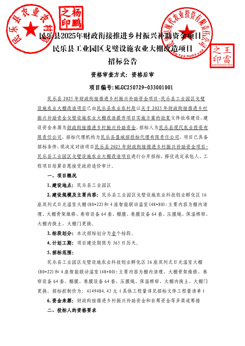 民乐县2025年财政衔接推进乡村振兴补助资金项目-民乐县工业园区戈璧设施农业大棚改造项目