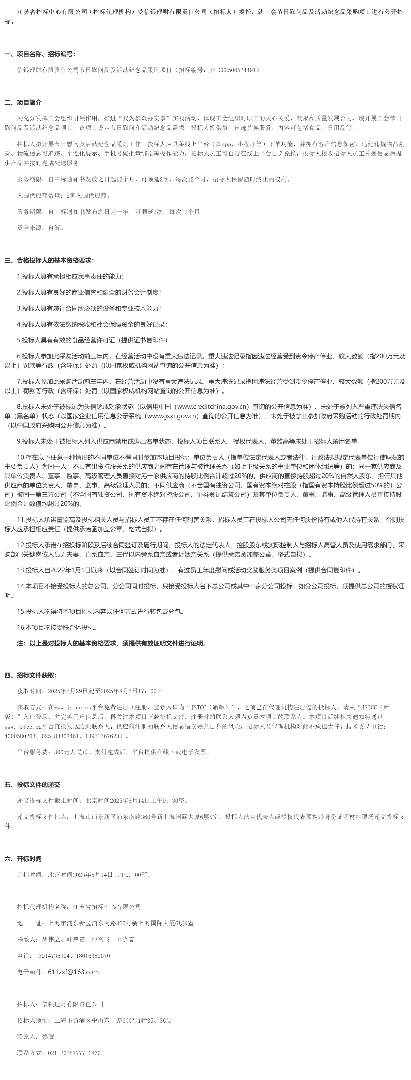 江苏省招标中心有限公司(招标代理机构)受信银理财有限责任公司(招标人)委托,就工会节日慰问品及活动纪念品采购项目进行公开招标。