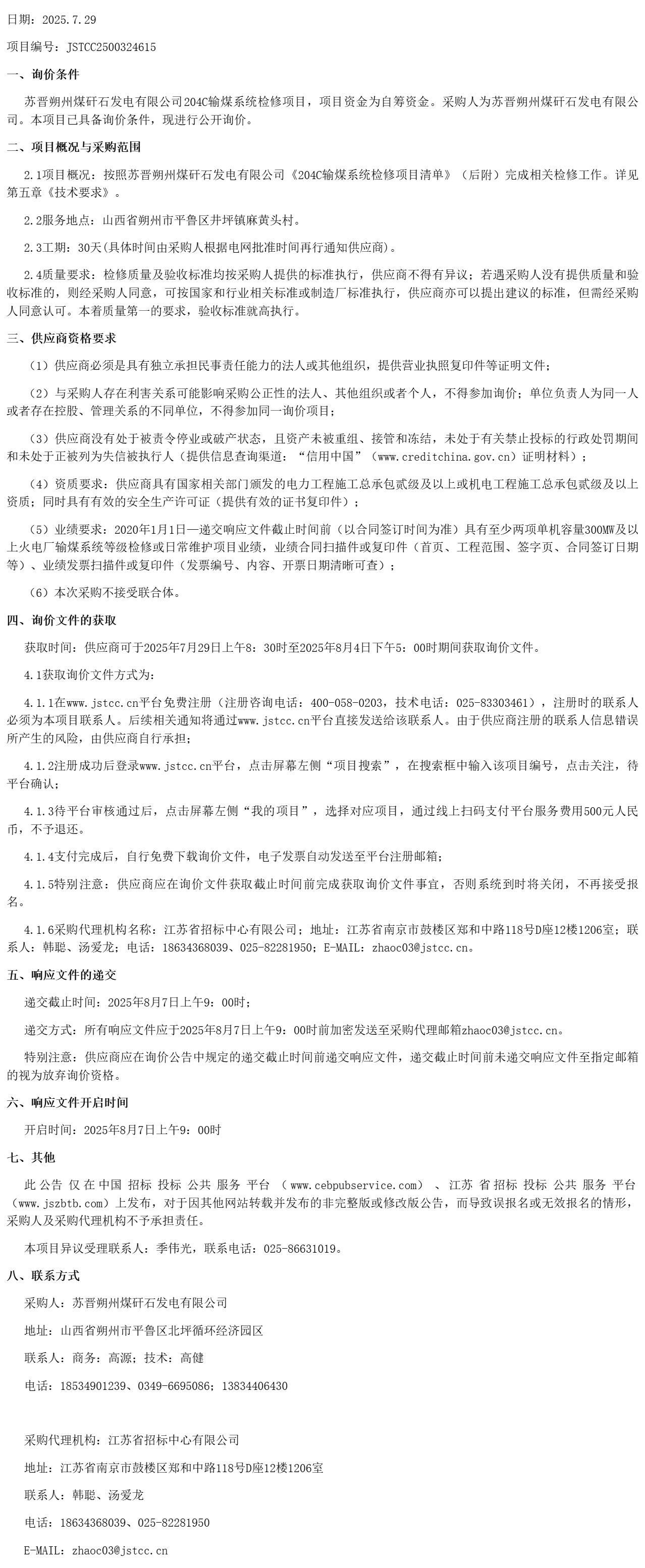 苏晋朔州煤矸石发电有限公司****输煤系统检修项目询价公告(***************)