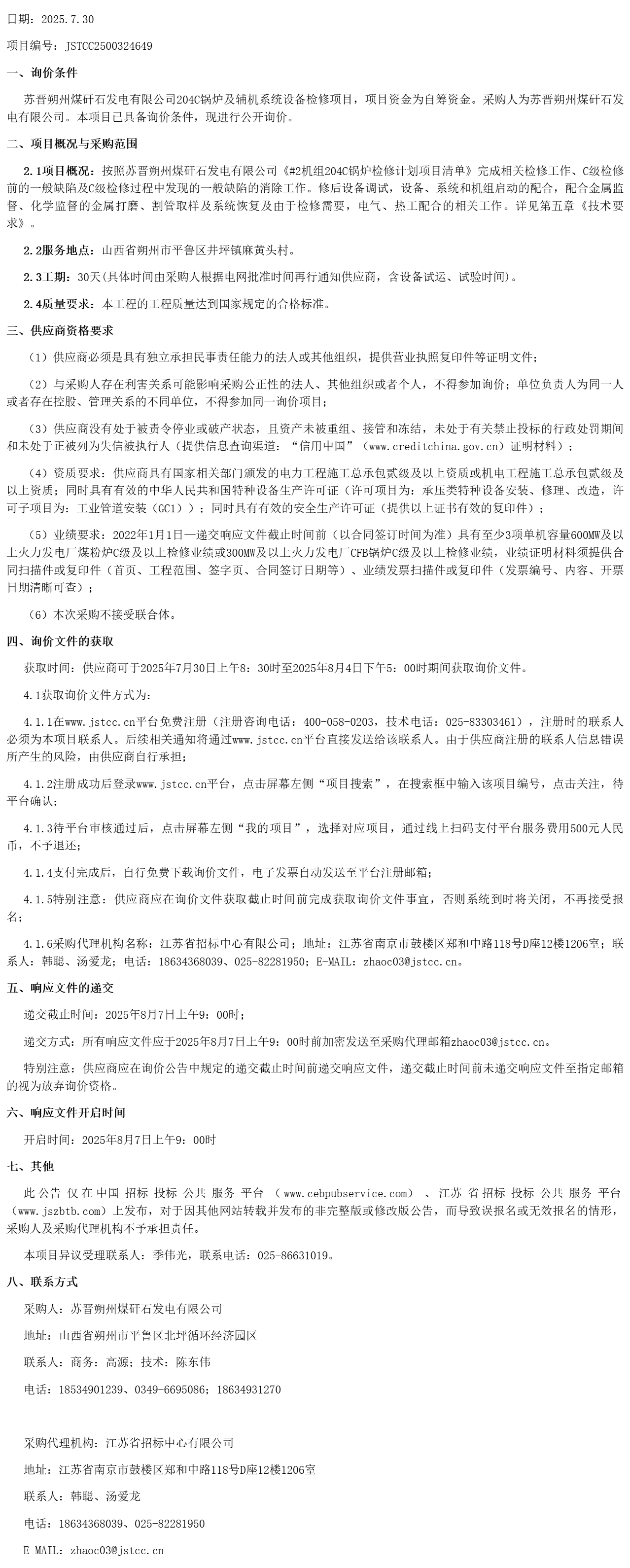 苏晋朔州煤矸石发电有限公司****锅炉及辅机系统设备检修项目询价公告(***************)