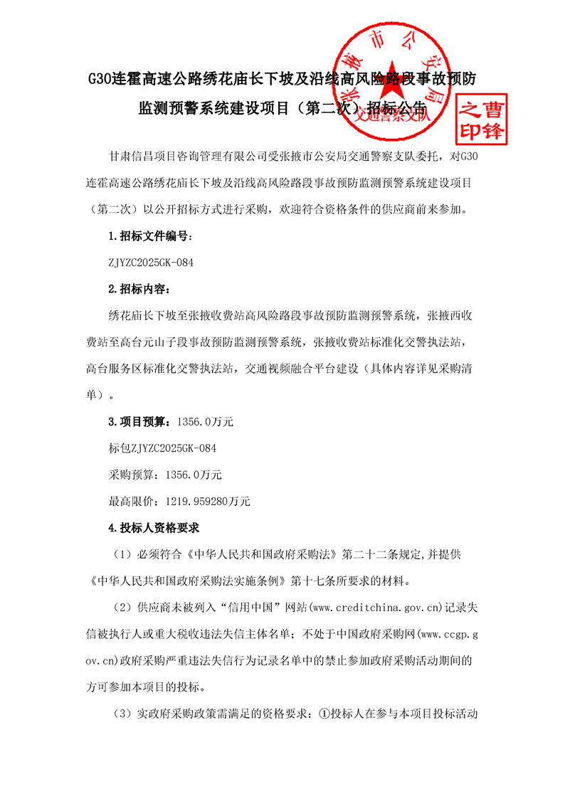 G30连霍高速公路绣花庙长下坡及沿线高风险路段事故预防监测预警系统建设项目(第二次)招标公告