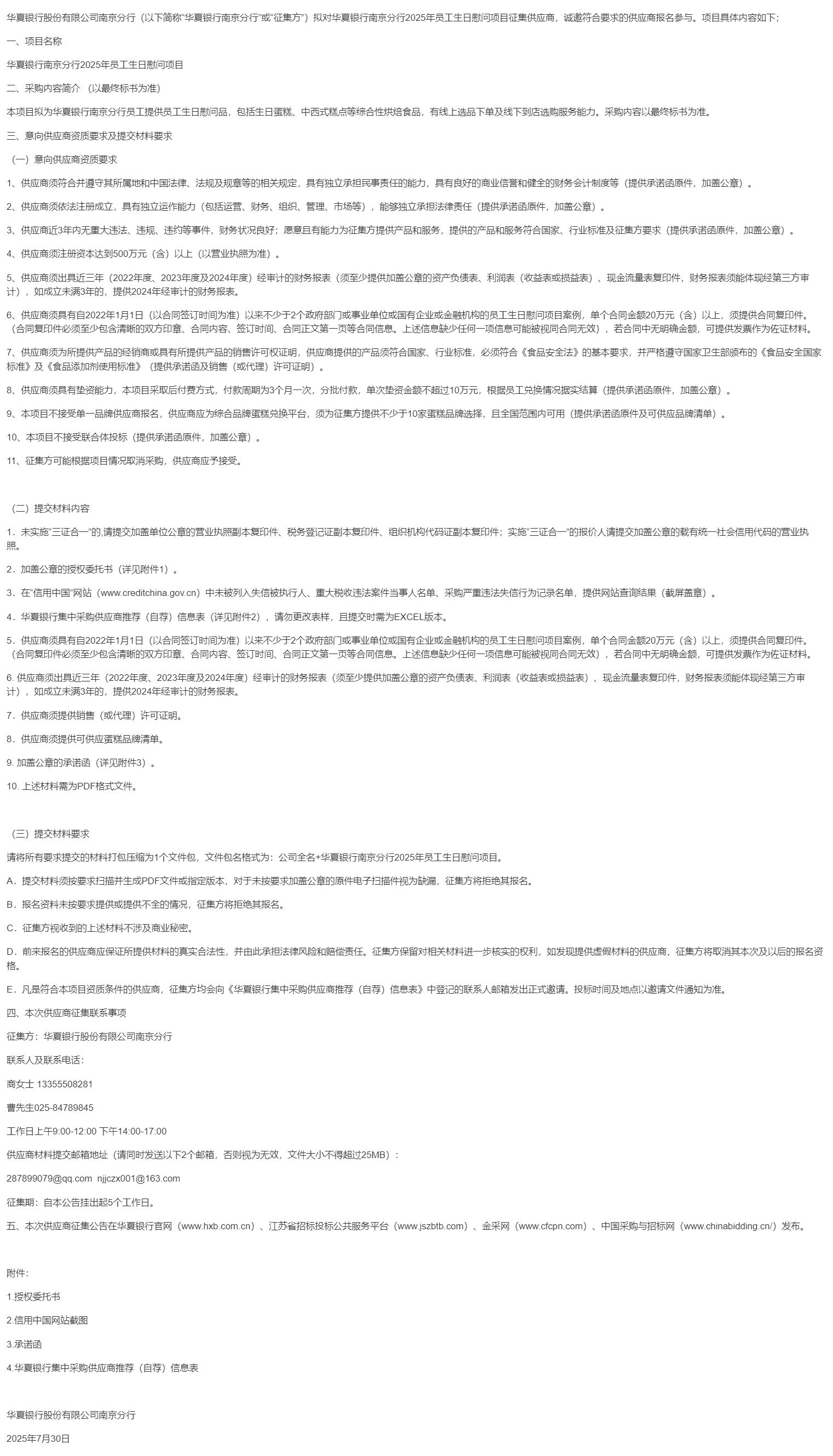 华夏银行股份有限公司南京分行(以下简称“华夏银行南京分行”或“征集方”)拟对华夏银行南京分行****年员工生日慰问项目征集供应商,诚邀符合要求的供应商报名参与。项目具体内容如下;
