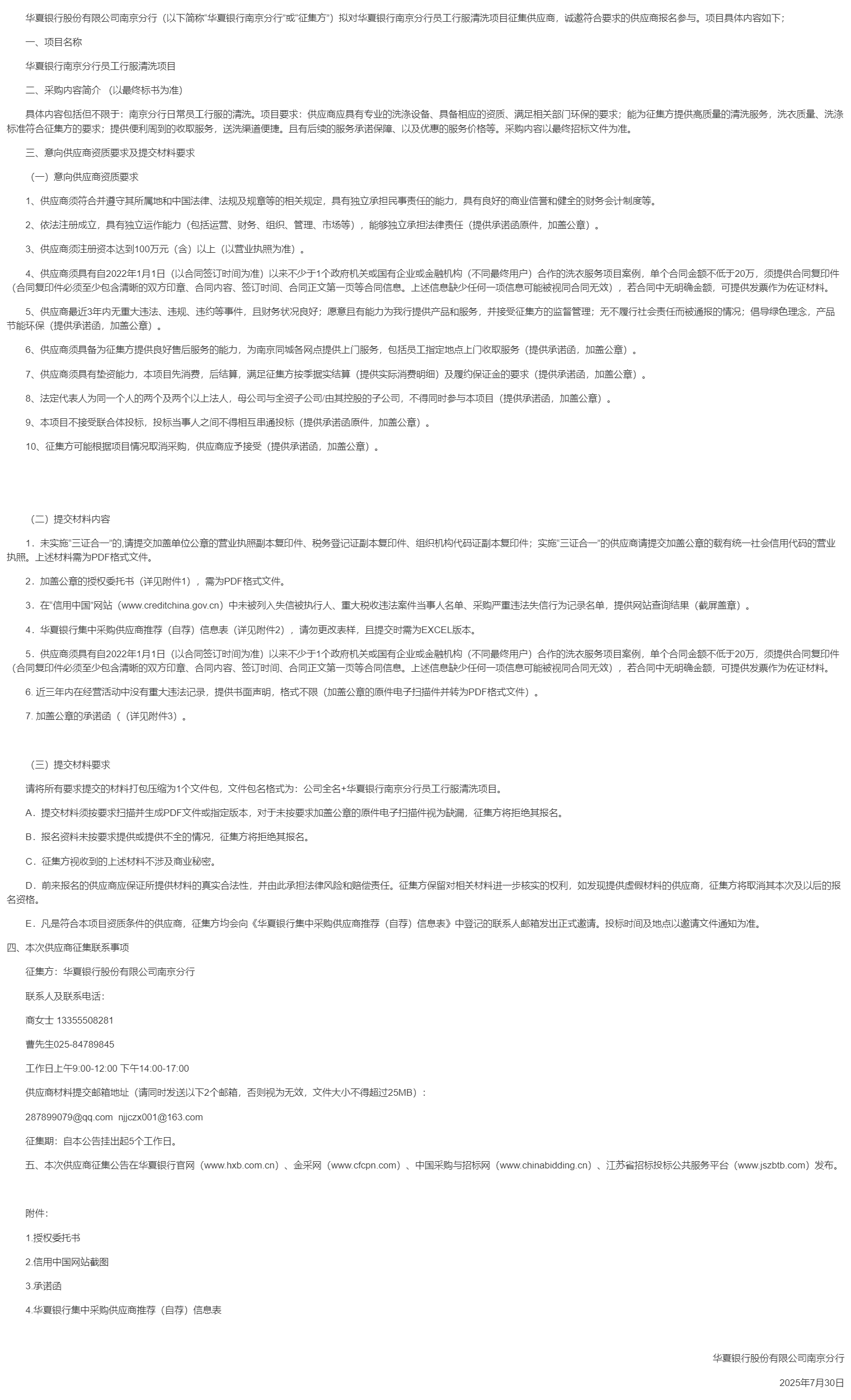 华夏银行股份有限公司南京分行(以下简称“华夏银行南京分行”或“征集方”)拟对华夏银行南京分行员工行服清洗项目征集供应商,诚邀符合要求的供应商报名参与。项目具体内容如下;