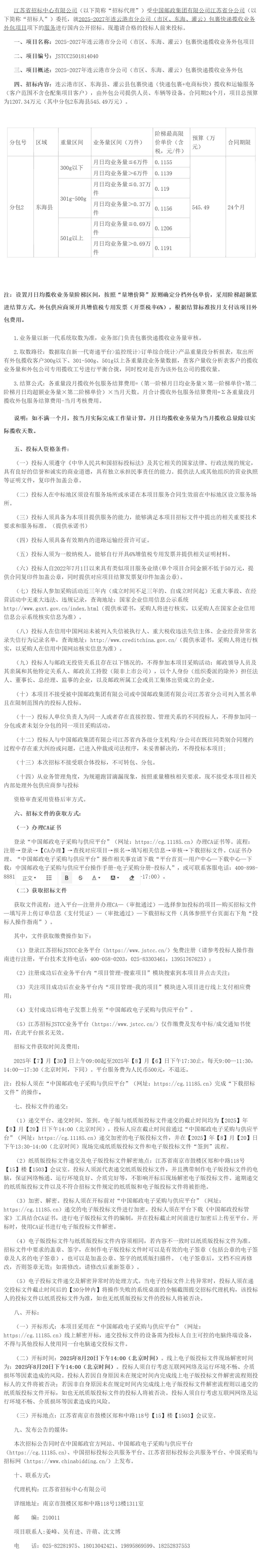 江苏省招标中心有限公司(以下简称“招标代理”)受中国邮政集团有限公司江苏省分公司(以下简称“招标人”)委托,就*********年连云港市分公司(市区、东海、灌云)包裹快递揽收业务外包项目项下的服务进行国内公开招标。现邀请合格的投标人前来投标。