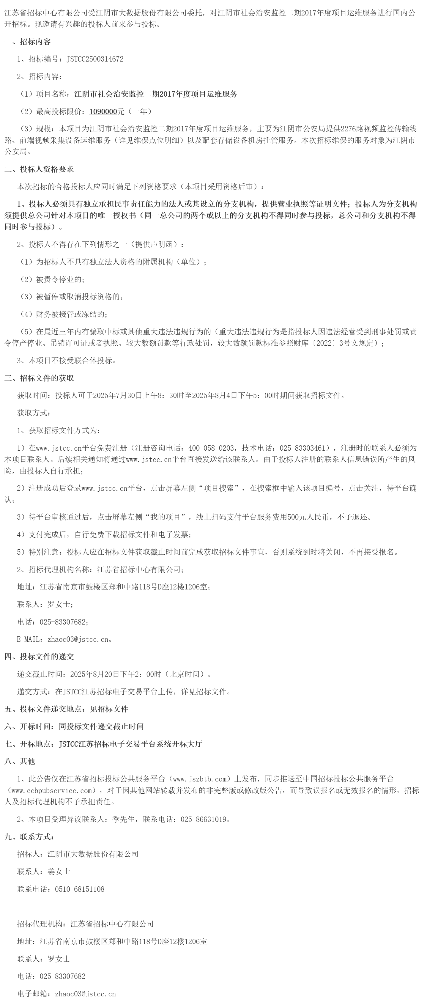 江阴市大数据股份有限公司江阴市社会治安监控二期****年度项目运维服务招标公告(***************)