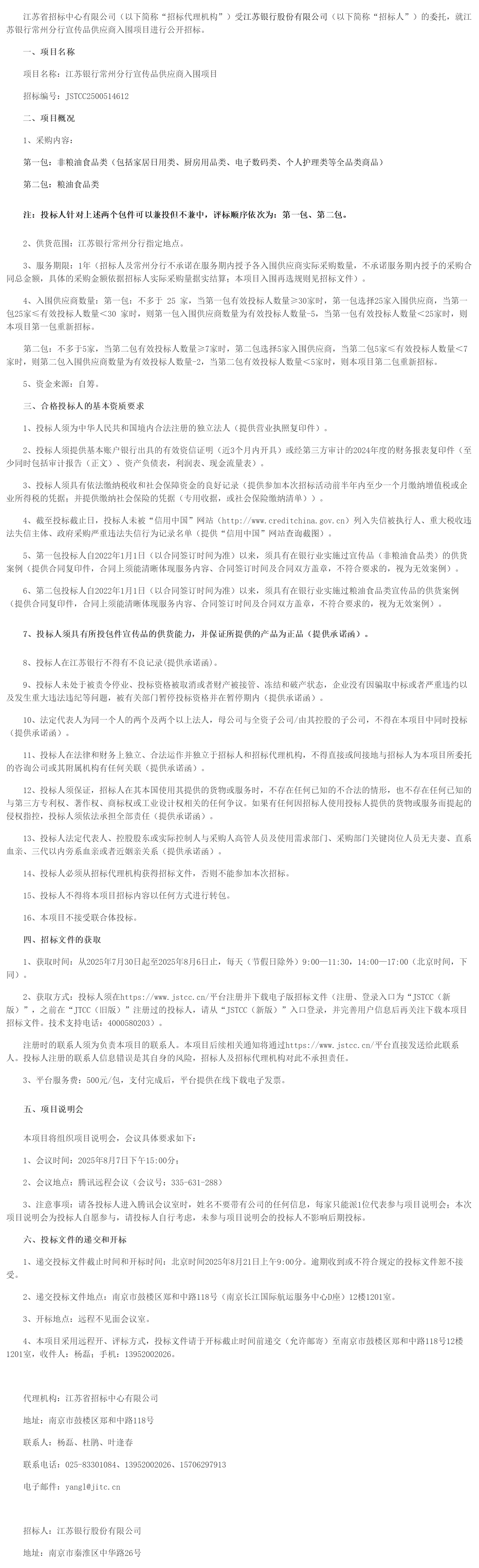 江苏银行常州分行宣传品供应商入围项目招标公告