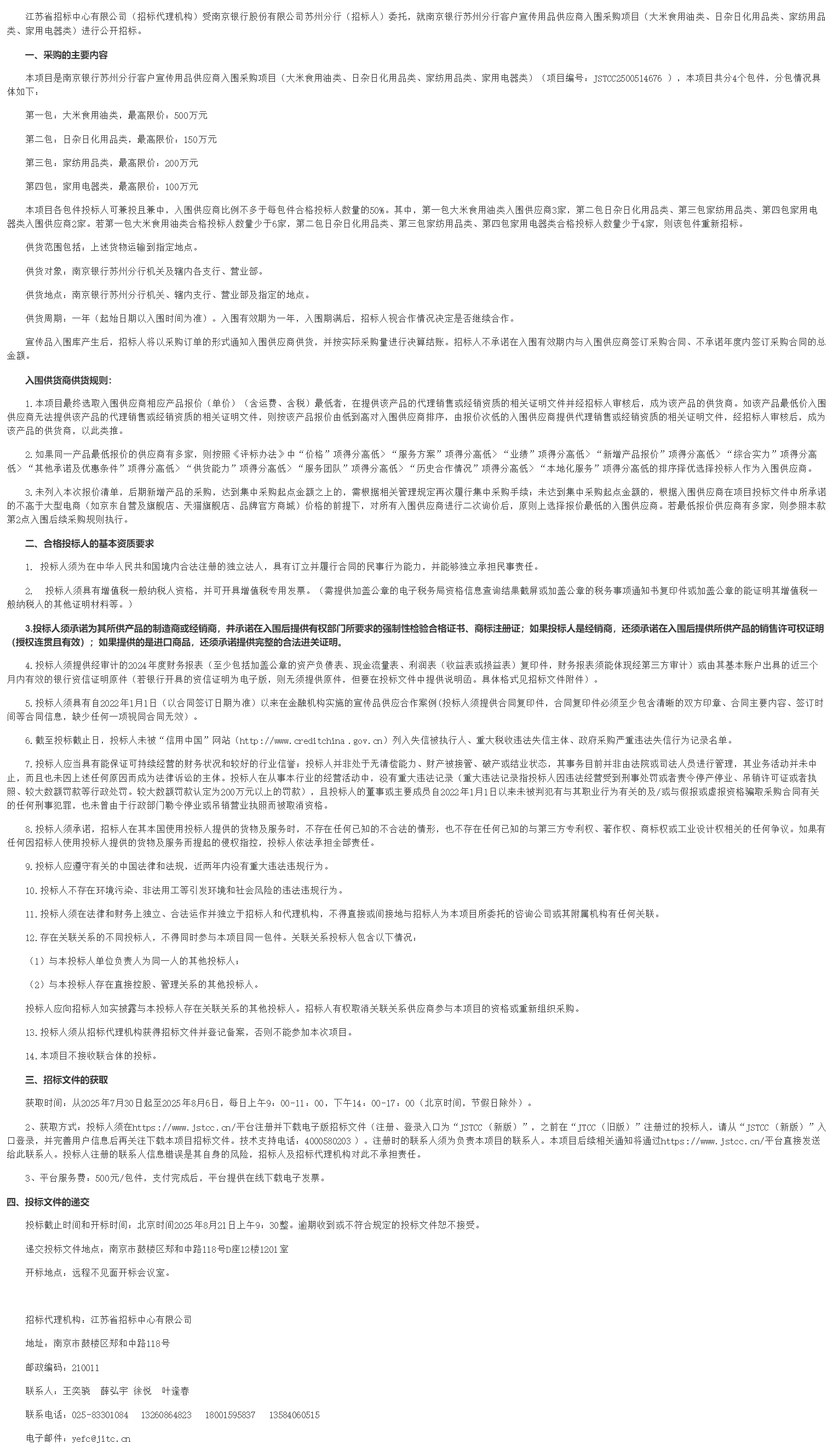 江苏省招标中心有限公司(招标代理机构)受南京银行股份有限公司苏州分行(招标人)委托,就南京银行苏州分行客户宣传用品供应商入围采购项目(大米食用油类、日杂日化用品类、家纺用品类、家用电器类)进行公开招标。