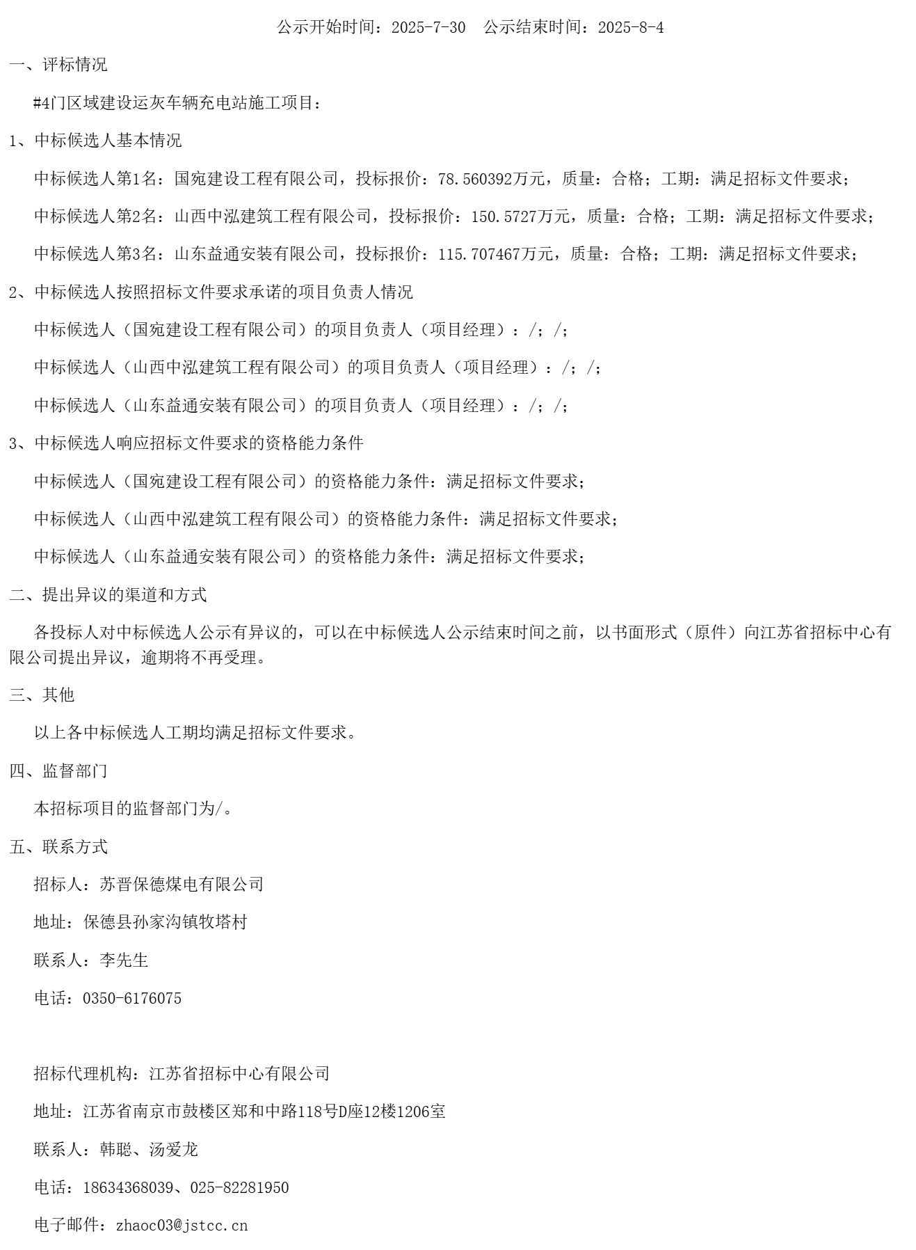 苏晋保德煤电有限公司#*门区域建设运灰车辆充电站施工项目中标候选人公示(***************)
