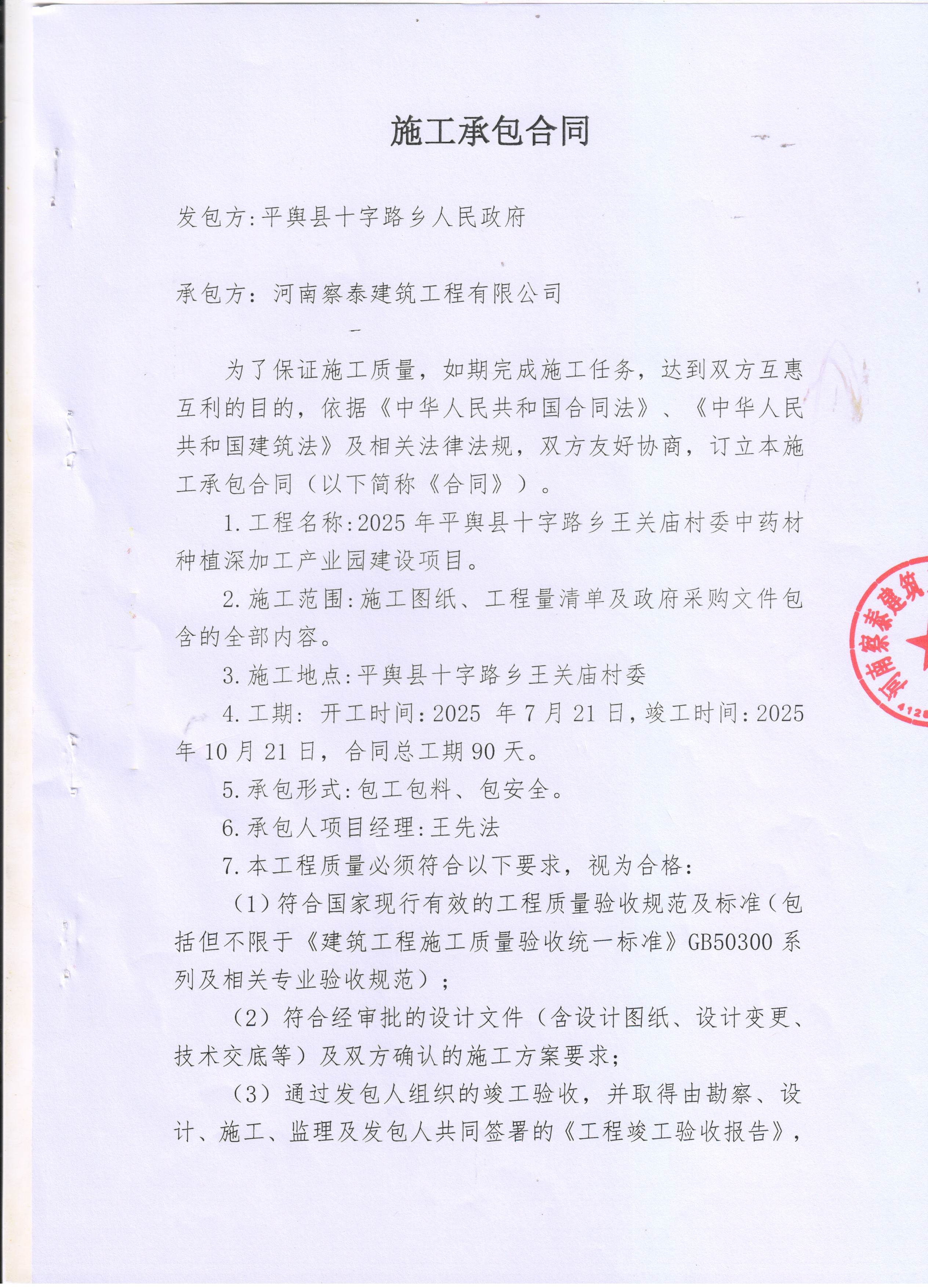 | 二、合同名称:****年平舆县十字路乡王关庙村委中药材种植深加工产业园建设项目 | ||||||||||||