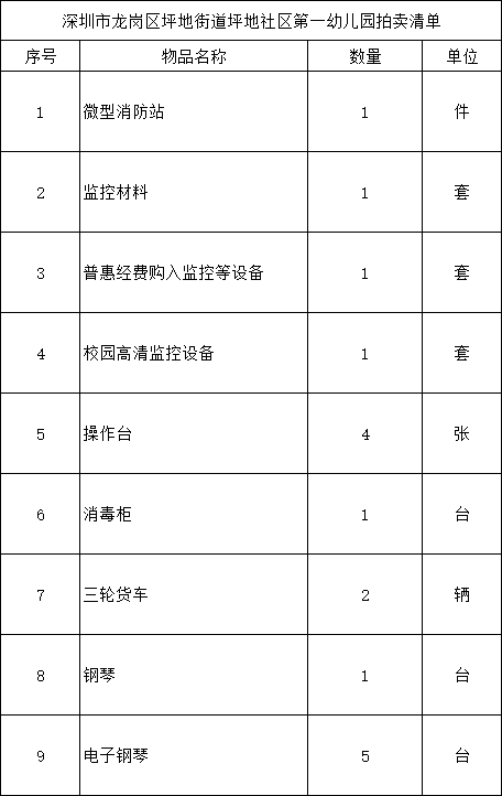 深圳金槌拍卖行拍卖公告(坪地社区第一幼儿园报废资产一批)