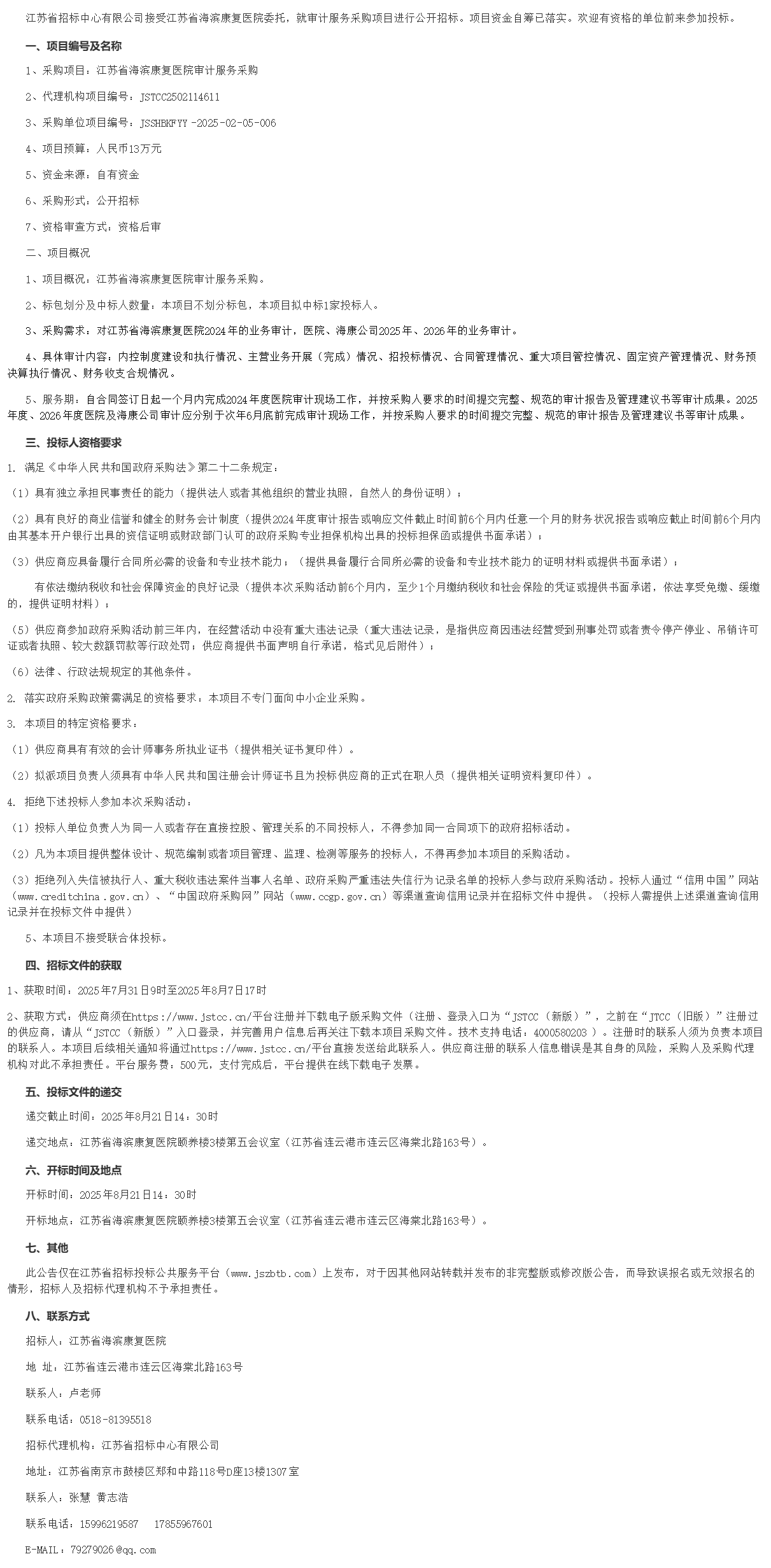 江苏省招标中心有限公司接受江苏省海滨康复医院委托,就审计服务采购项目进行公开招标。项目资金自筹已落实。欢迎有资格的单位前来参加投标。