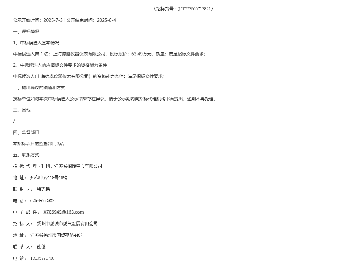 2025-2026年度区域调压站燃气压力监测设备采购-中标候选人公示