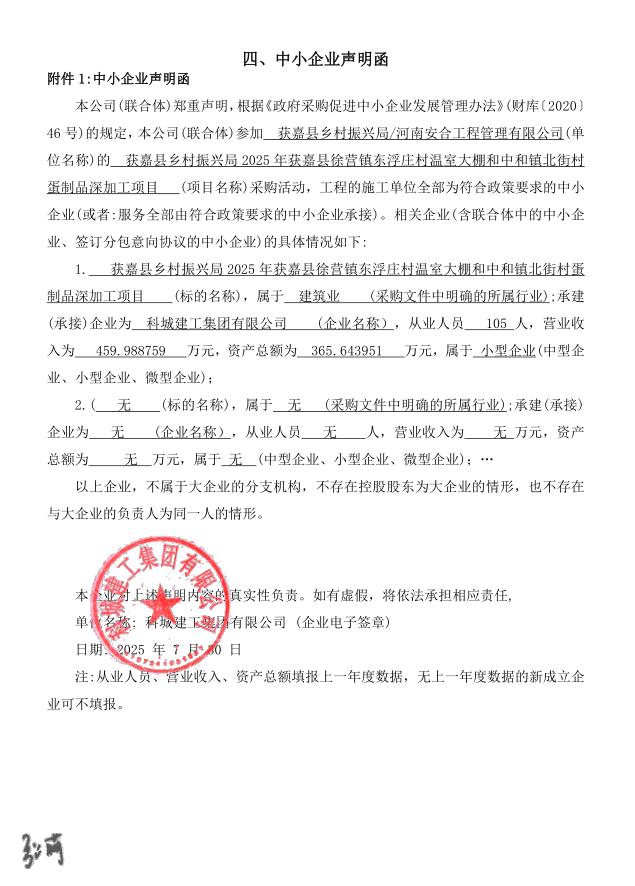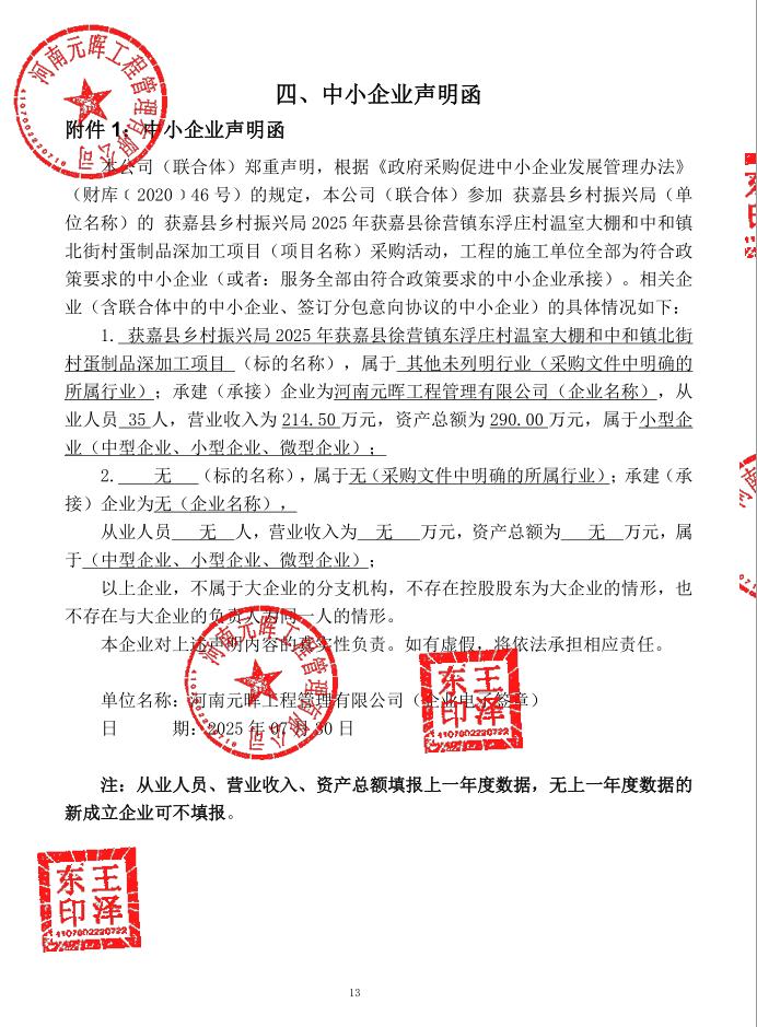 获嘉县乡村振兴局2025年获嘉县徐营镇东浮庄村温室大棚和中和镇北街村蛋制品深加工项目-成交公告