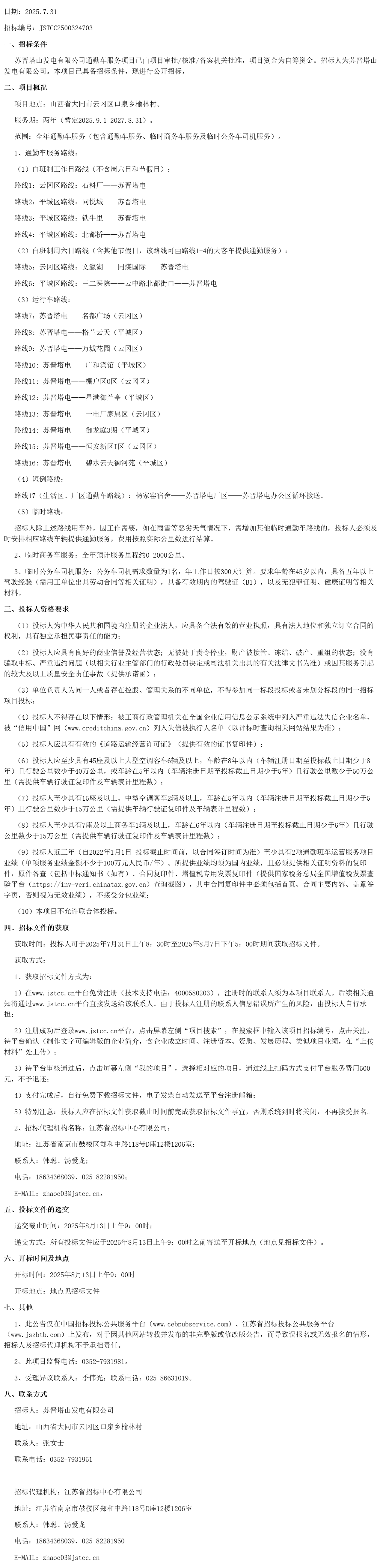 苏晋塔山发电有限公司通勤车服务项目招标公告(***************)