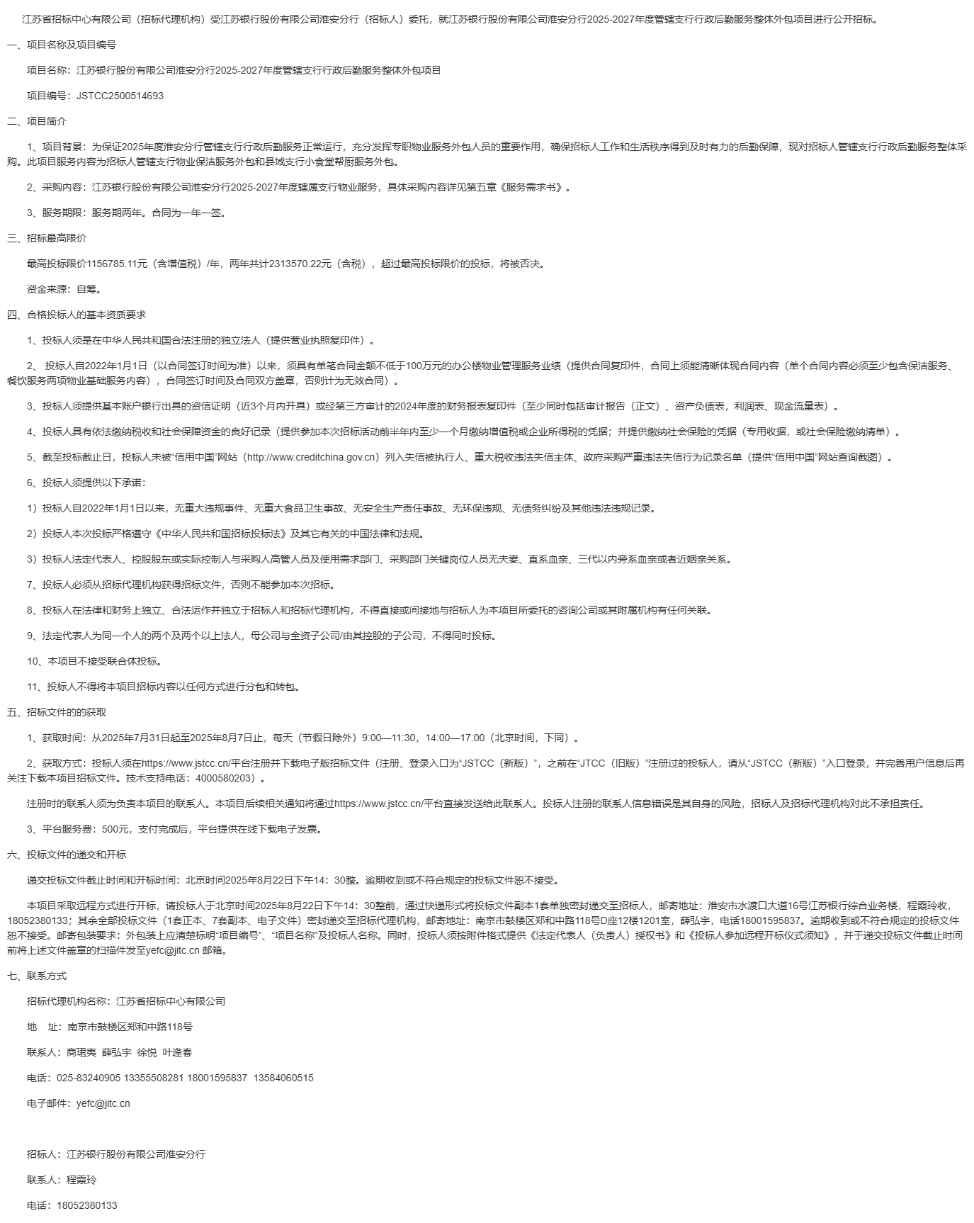江苏银行股份有限公司淮安分行*********年度管辖支行行政后勤服务整体外包项目招标公告