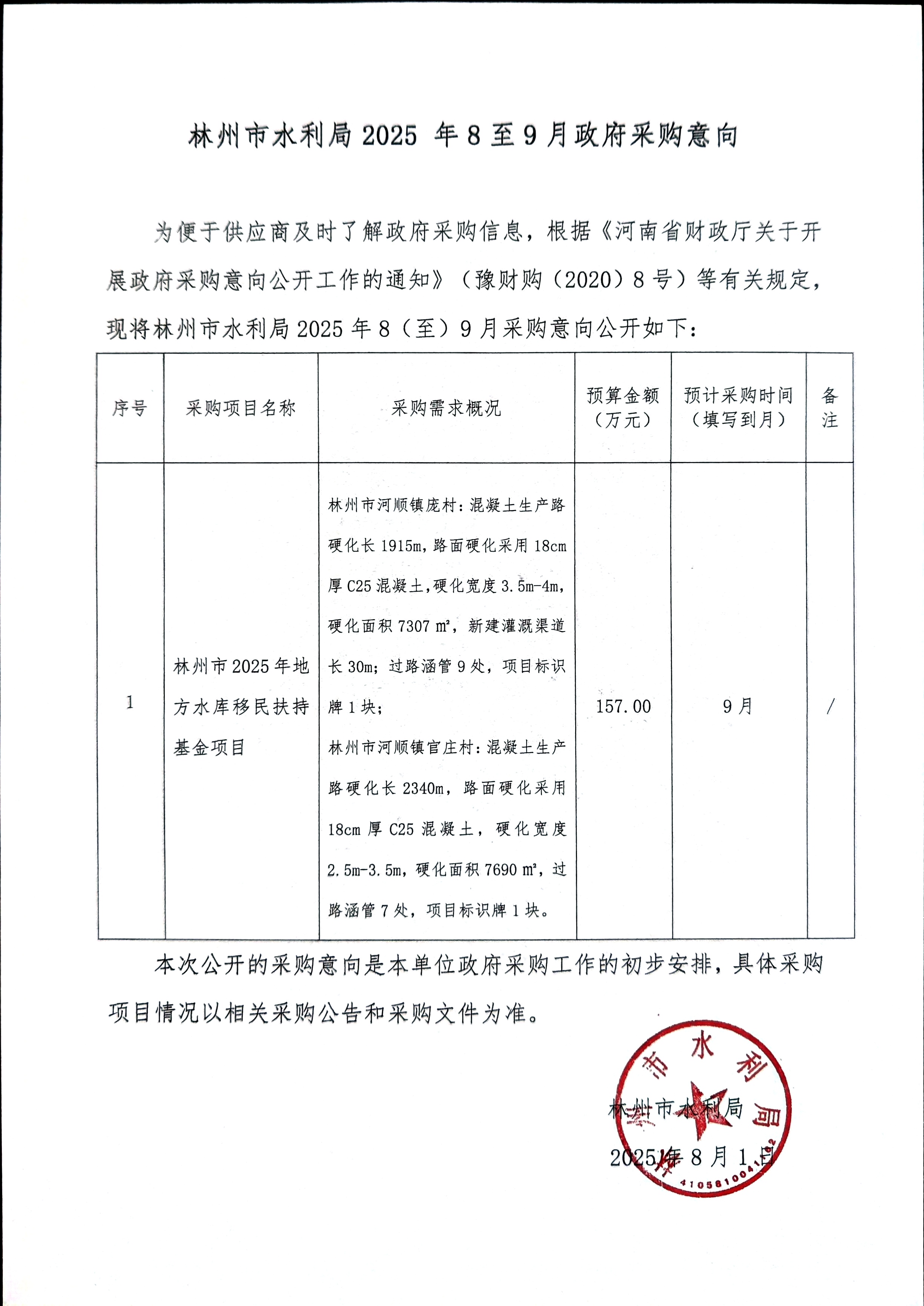林州市水利局2025年8至9月政府采购意向