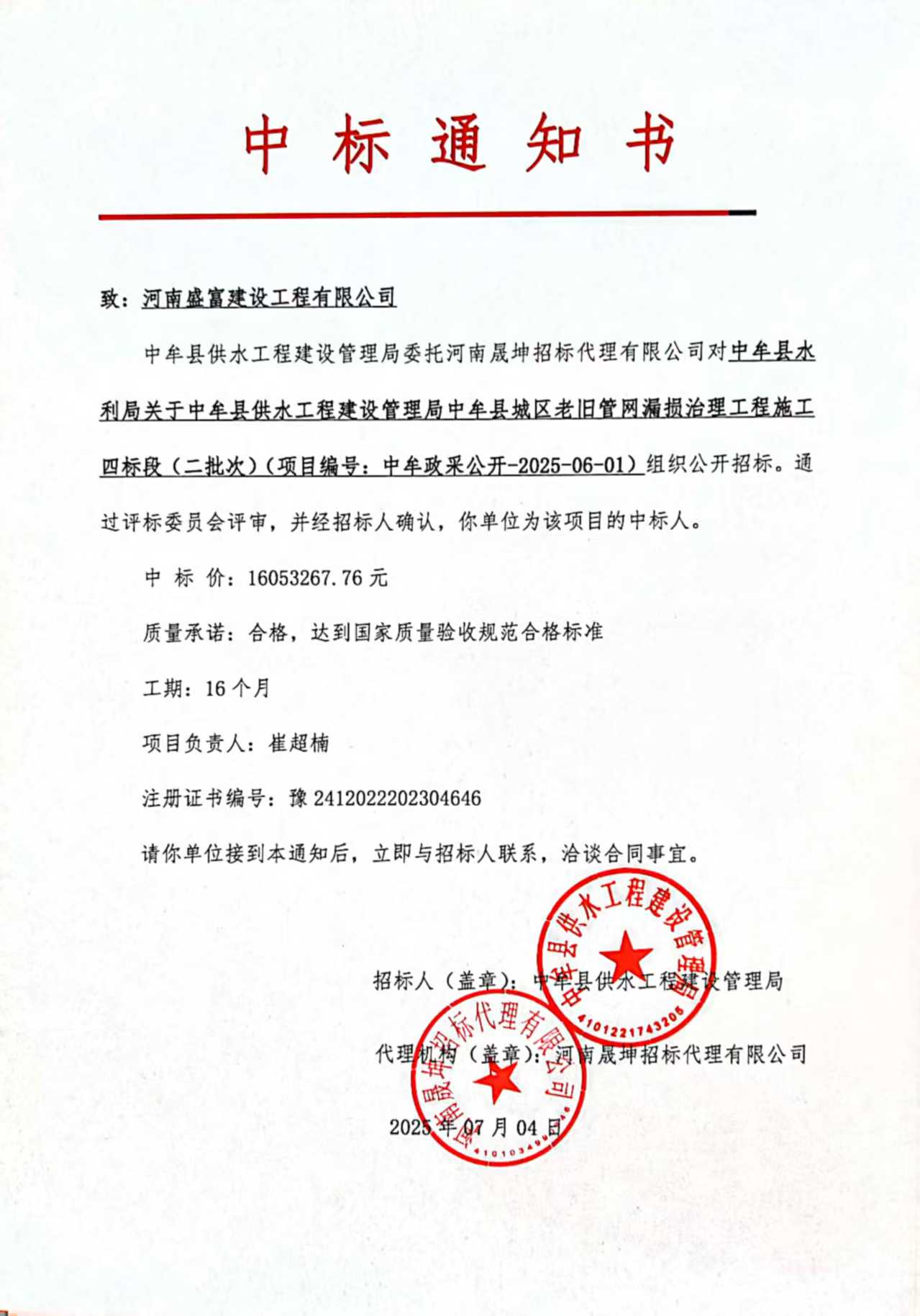 | 四、项目名称:中牟县水利局关于中牟县供水工程建设管理局中牟县城区老旧管网漏损治理工程施工及监理(第二批次)项目 | ||||||||||||