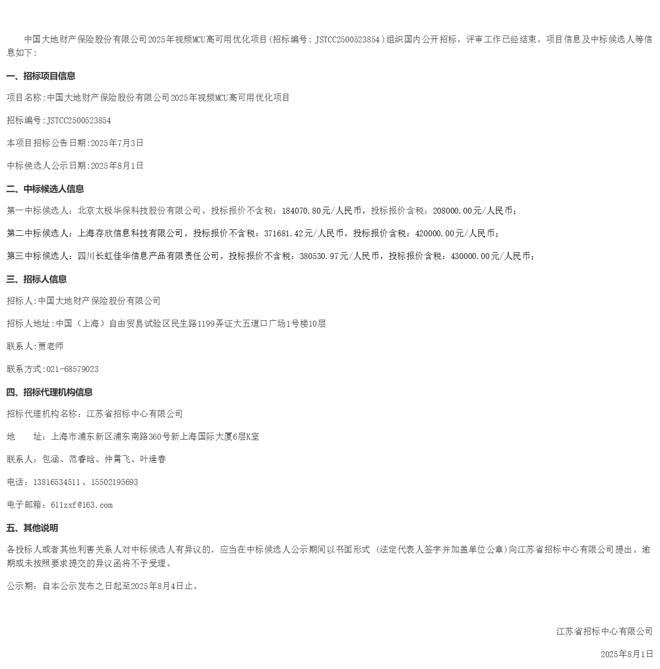 中国大地财产保险股份有限公司****年视频***高可用优化项目中标候选人公示