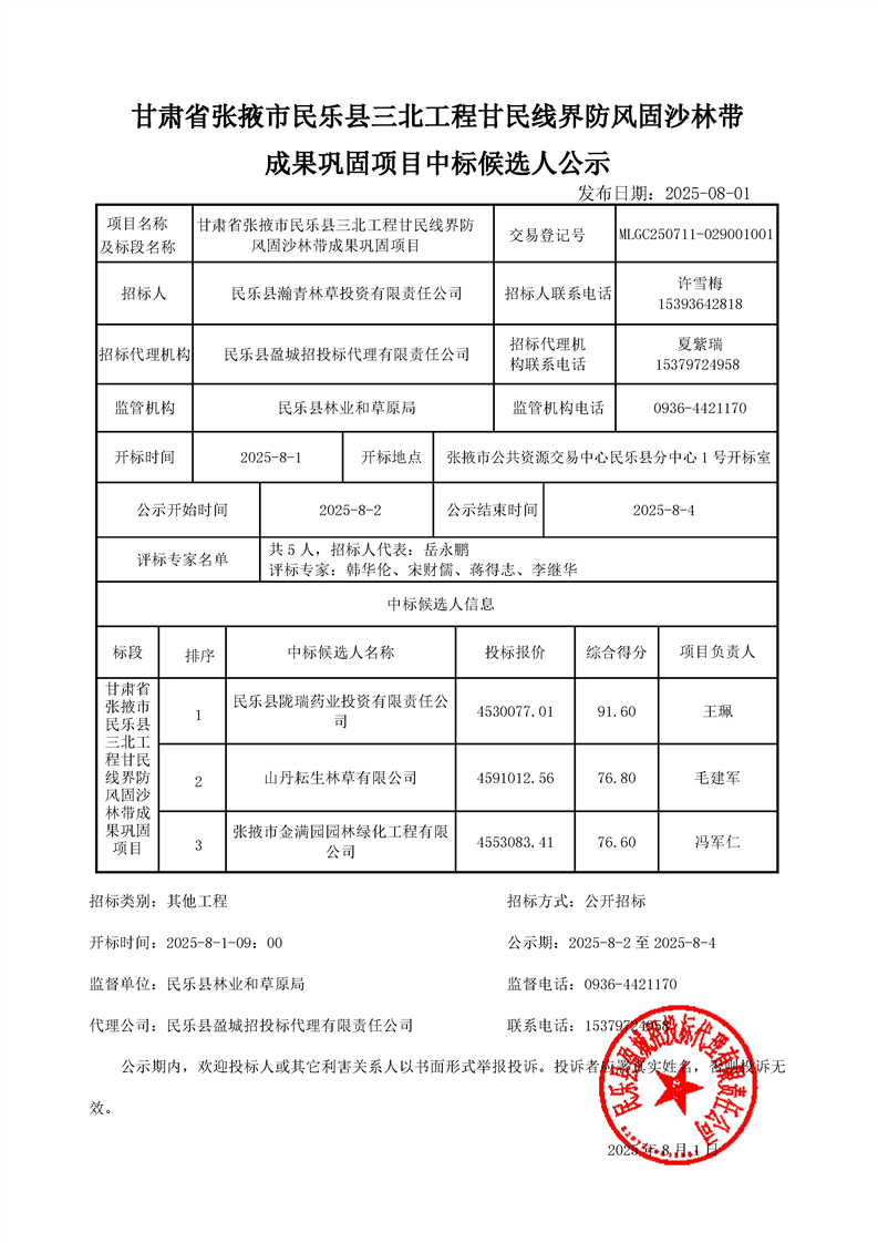 [民乐县]甘肃省张掖市民乐县三北工程甘民线界防风固沙林带成果巩固项目中标候选人公示交易结果公示
