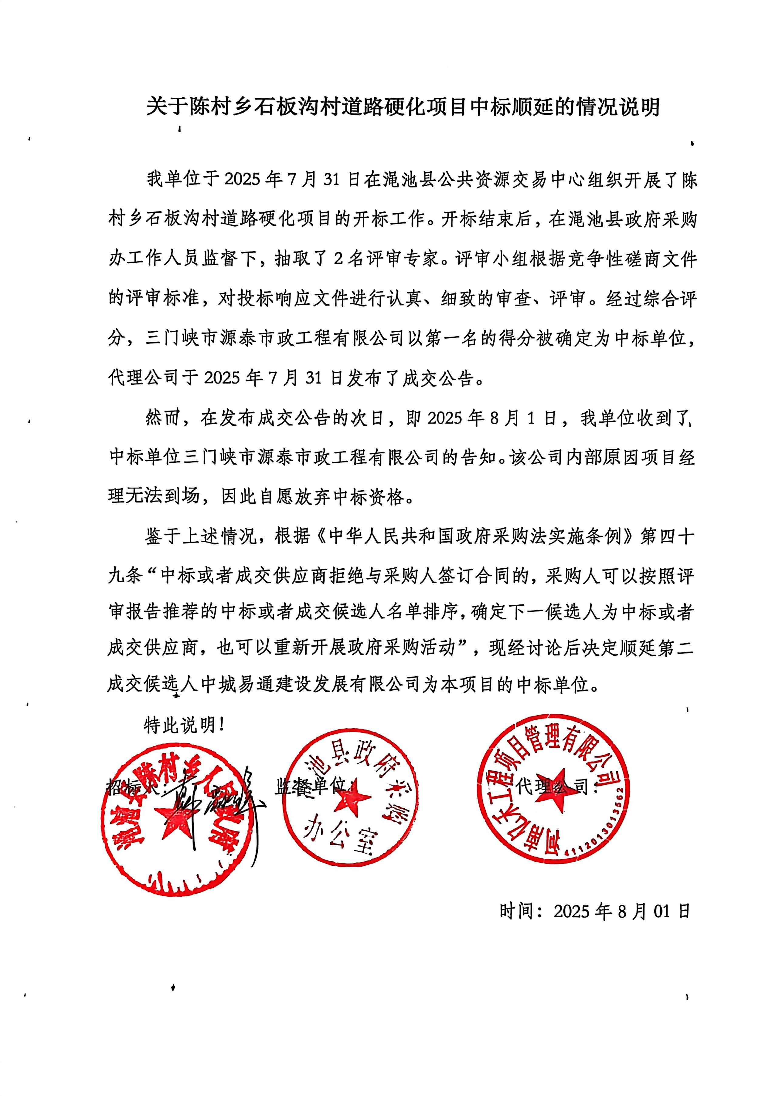 渑池县陈村乡人民政府陈村乡石板沟村道路硬化项目*结果更正公告
