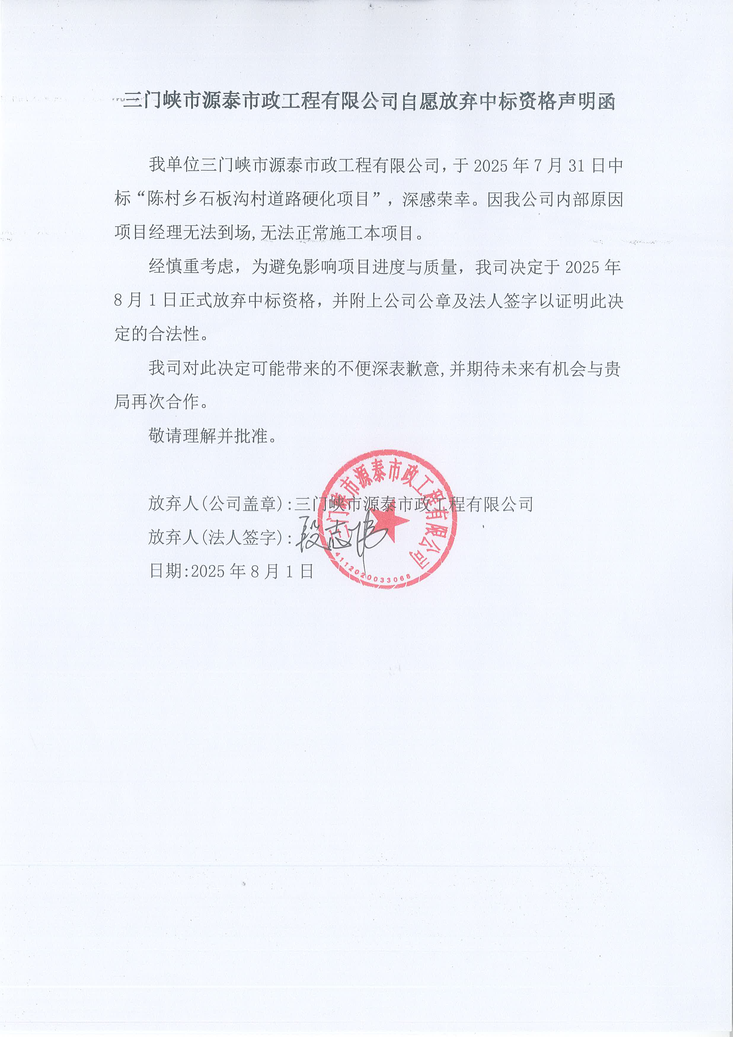 | 原成交单位“三门峡市源泰市政工程有限公司因”项目经理无法到场,无法正常施工本项目”,并向采购人递交了放弃函。根据《政府采购竞争性磋商采购方式管理暂行办法》第三十三条规定及本项目的评标报告,采购人依法顺延第二成交候选人“中城易通建设发展有限公司”为成交供应商。 | ||||||||||||