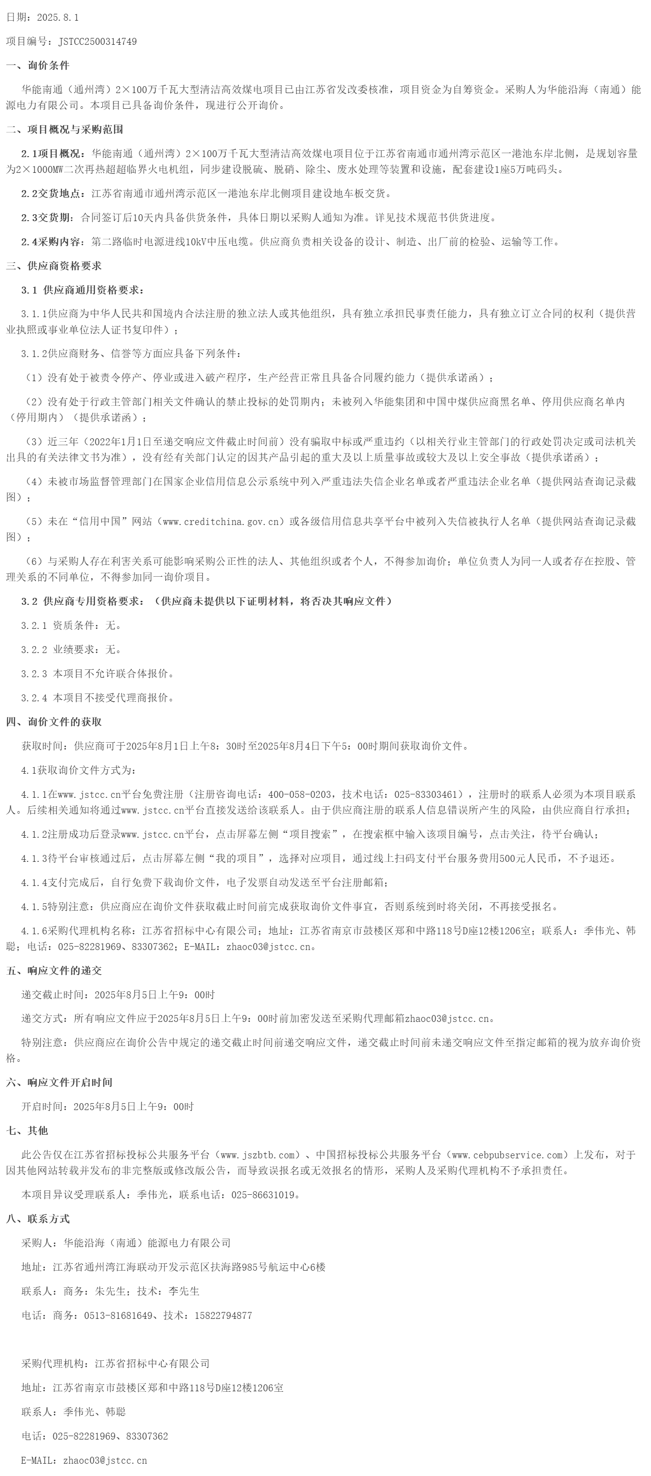 华能南通(通州湾)*×***万千瓦大型清洁高效煤电项目已由江苏省发改委核准,项目资金为自筹资金。采购人为华能沿海(南通)能源电力有限公司。本项目已具备询价条件,现进行公开询价。