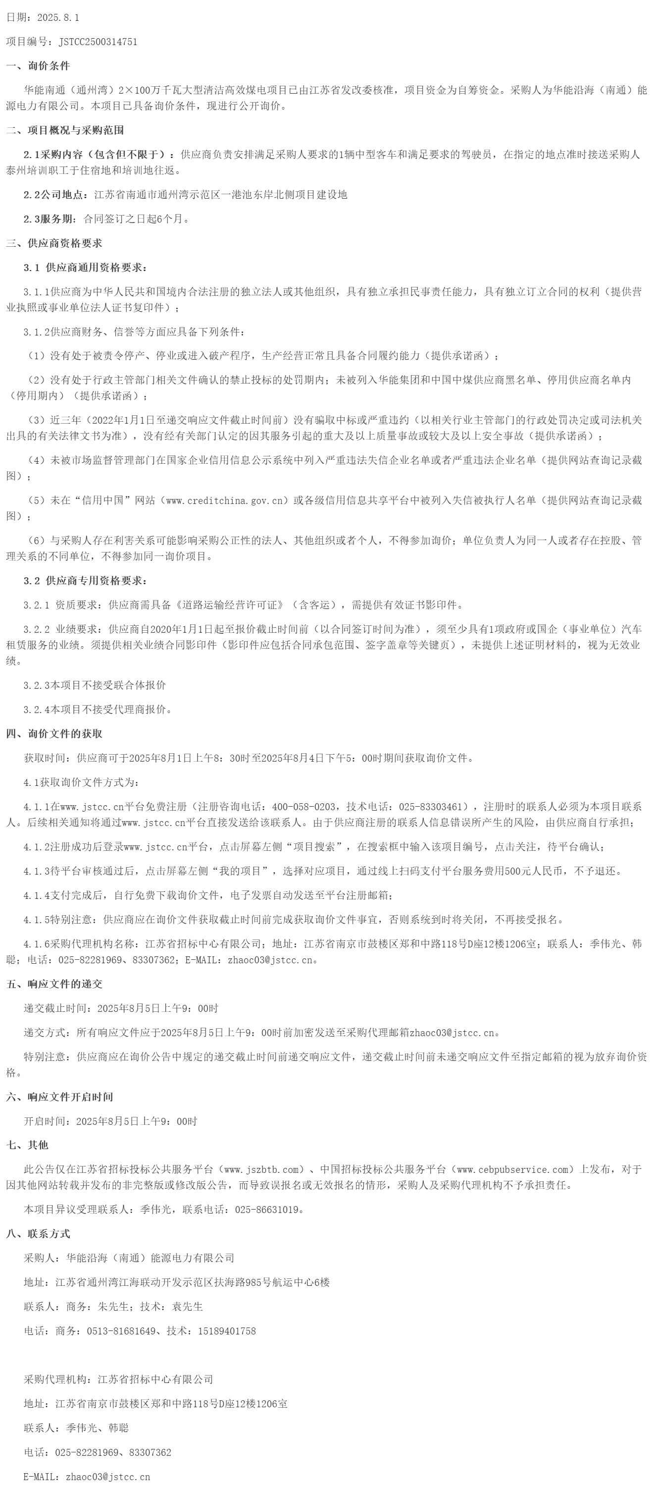 华能南通(通州湾)*×***万千瓦大型清洁高效煤电项目生产准备部泰州培训通勤服务询价公告(***************)