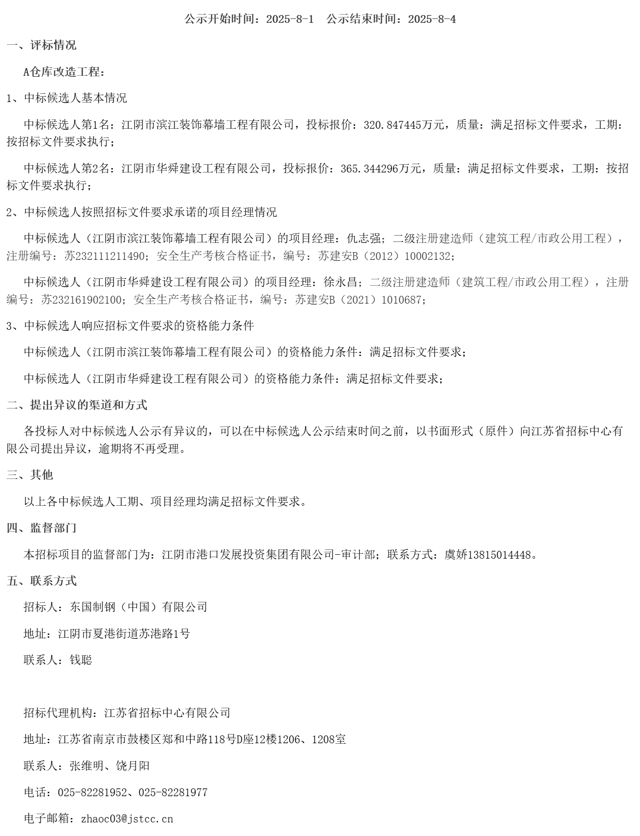 东国制钢(中国)有限公司*仓库改造工程中标候选人公示(***************)