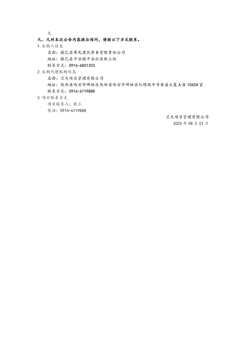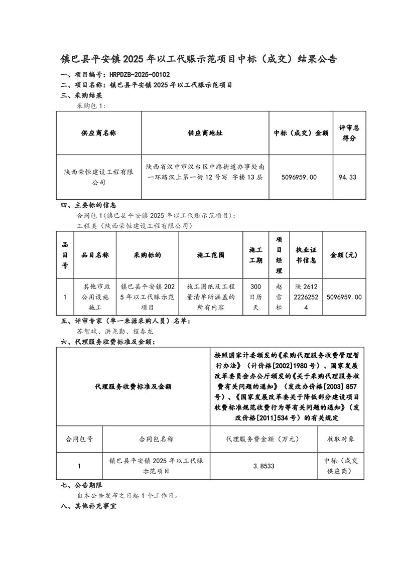 镇巴县平安镇2025年以工代赈示范项目中标(成交)结果公告