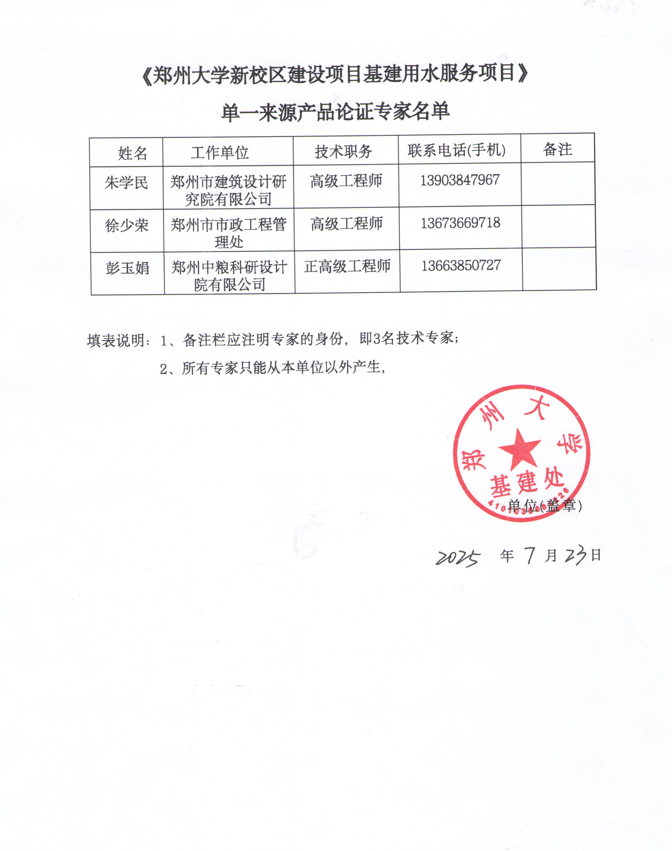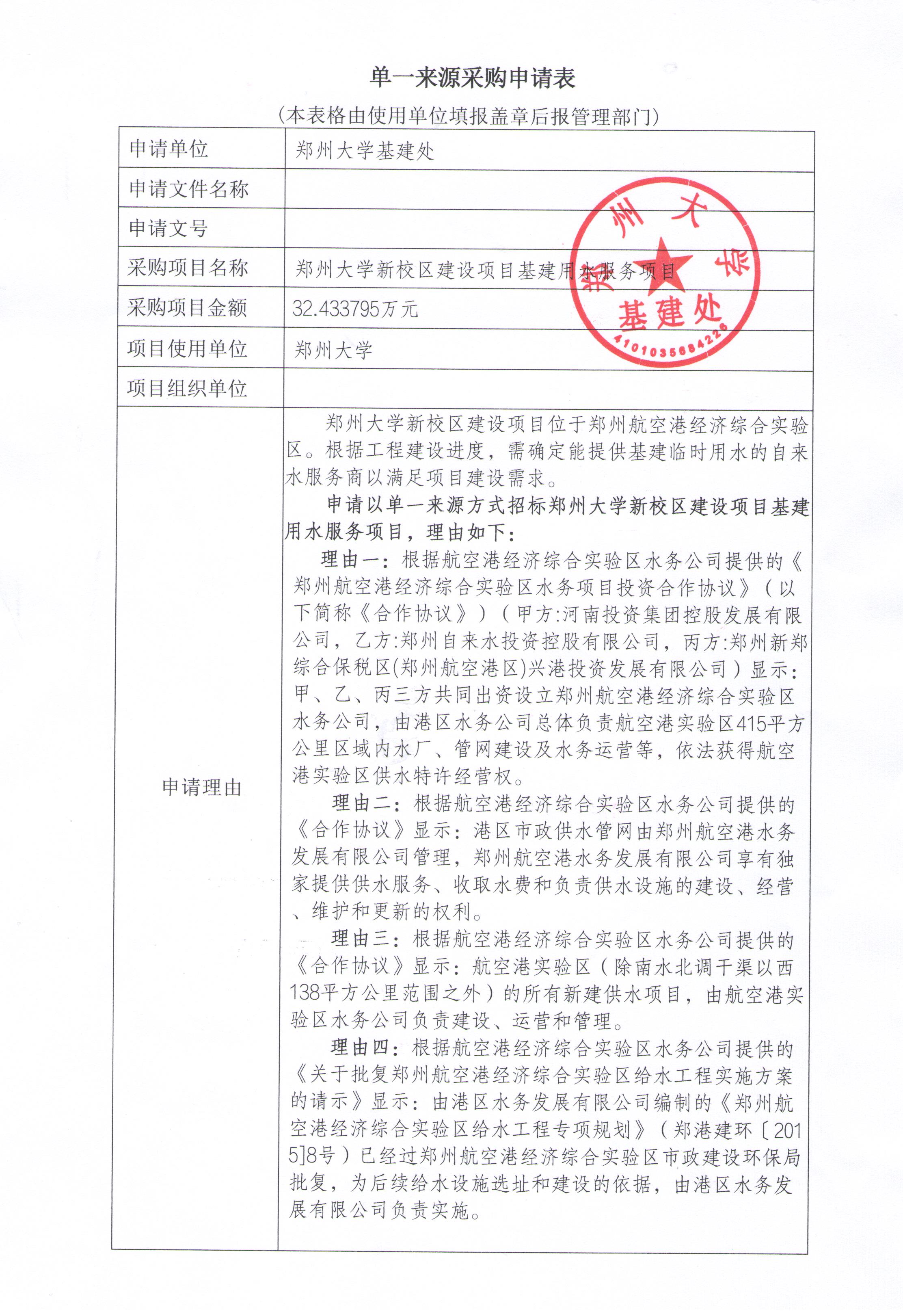 郑州大学新校区建设项目基建用水服务项目单一来源采购公示