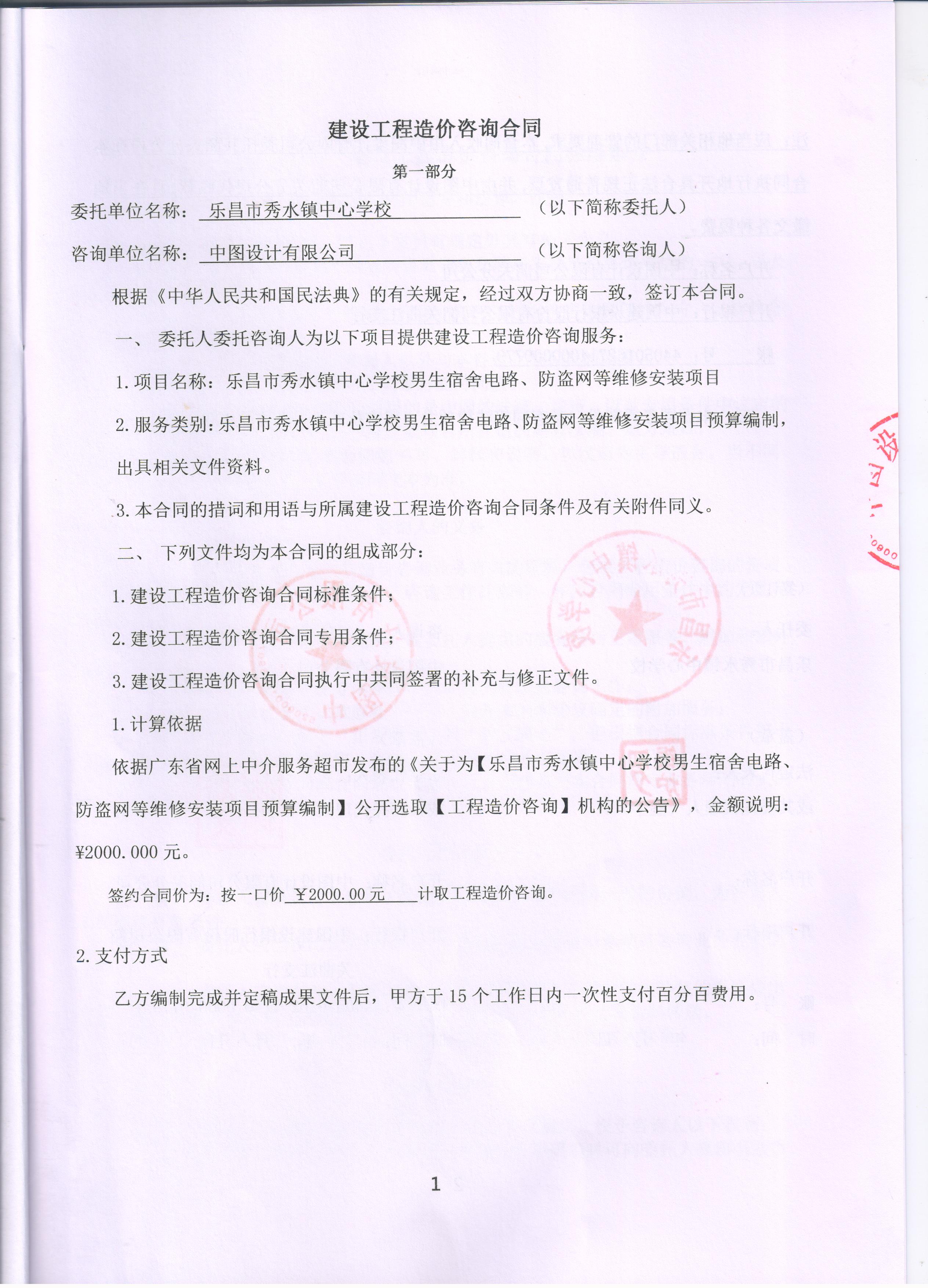 乐昌市秀水镇中心学校男生宿舍电路、防盗网等维修安装项目预算编制合同公开