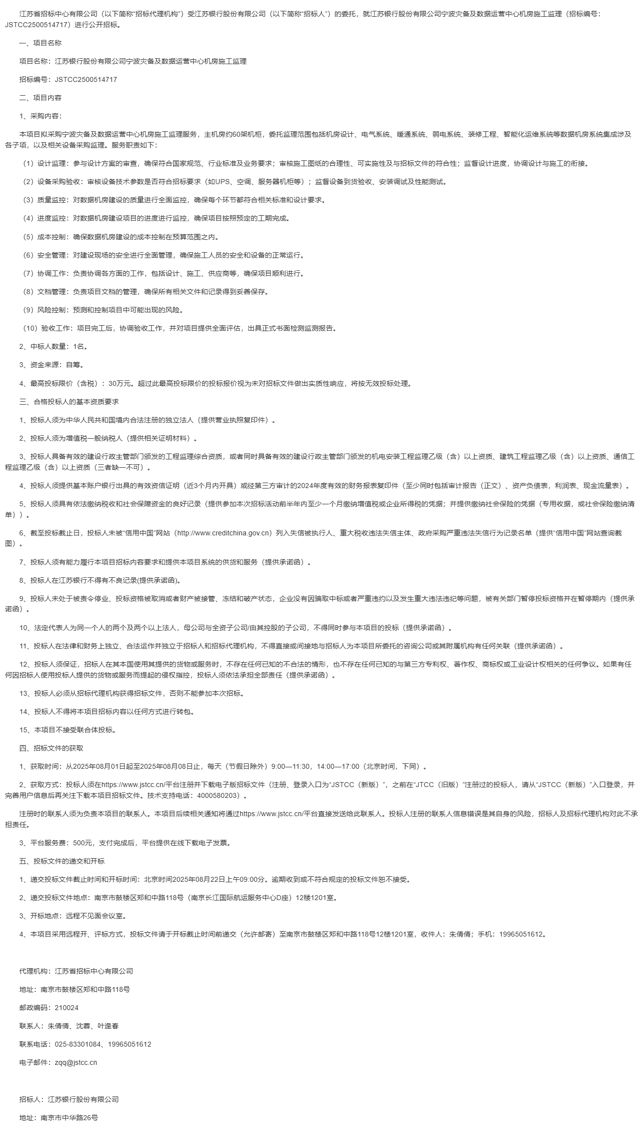 江苏银行股份有限公司宁波灾备及数据运营中心机房施工监理招标公告
