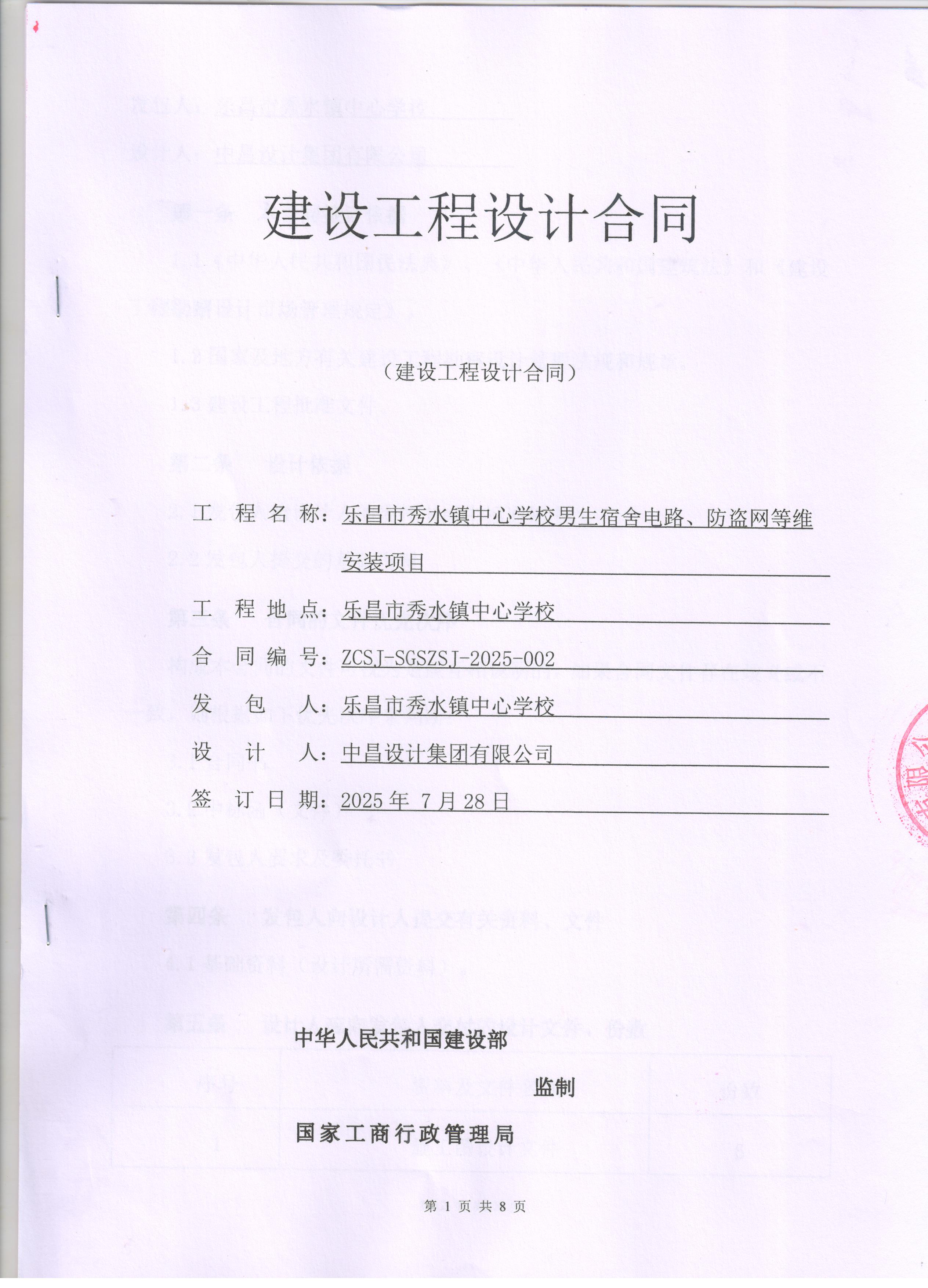 乐昌市秀水镇中心学校男生宿舍电路、防盗网等维修安装进行施工图纸设计,出具相关文件资料。