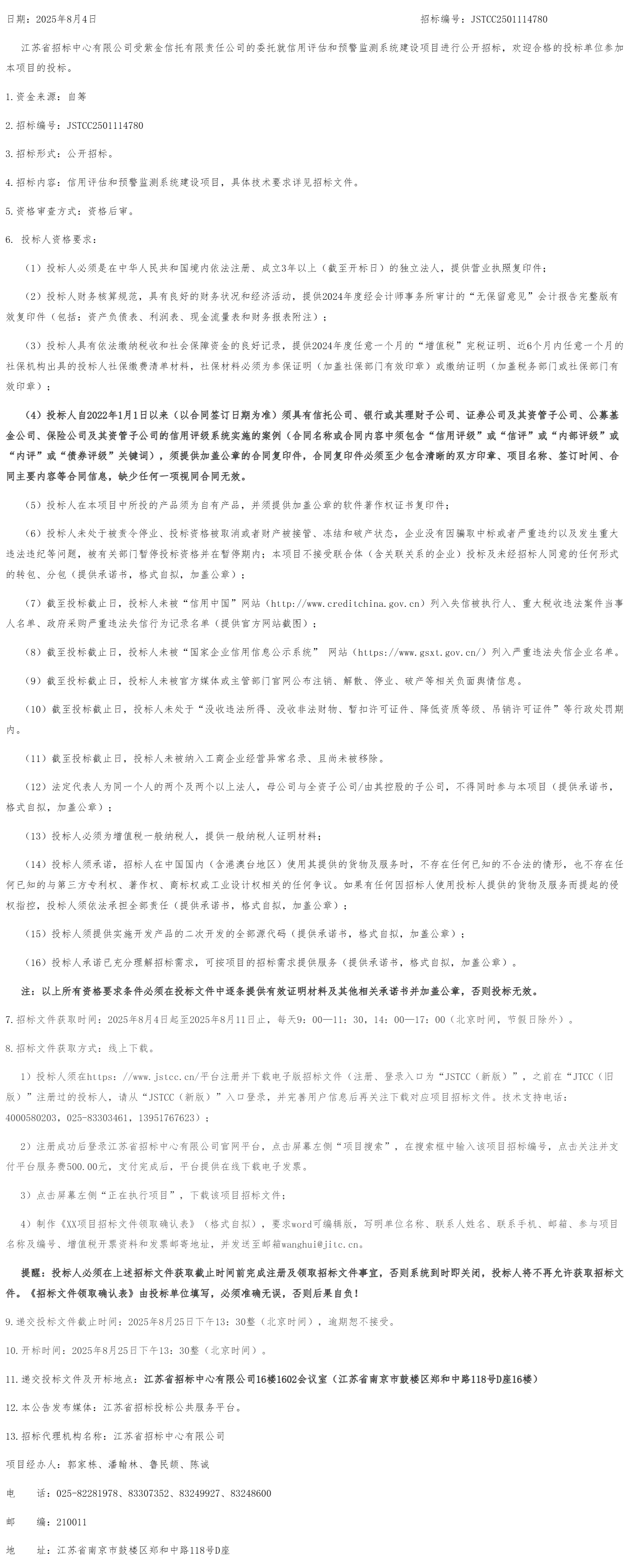 江苏省招标中心有限公司受紫金信托有限责任公司的委托就信用评估和预警监测系统建设项目进行公开招标,欢迎合格的投标单位参加本项目的投标。