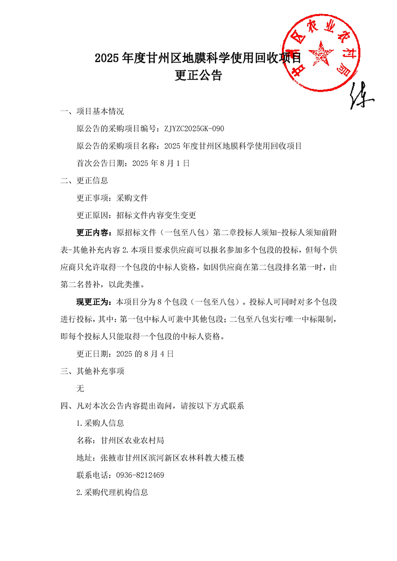 2025年度甘州区地膜科学使用回收项目(二次)更正公告