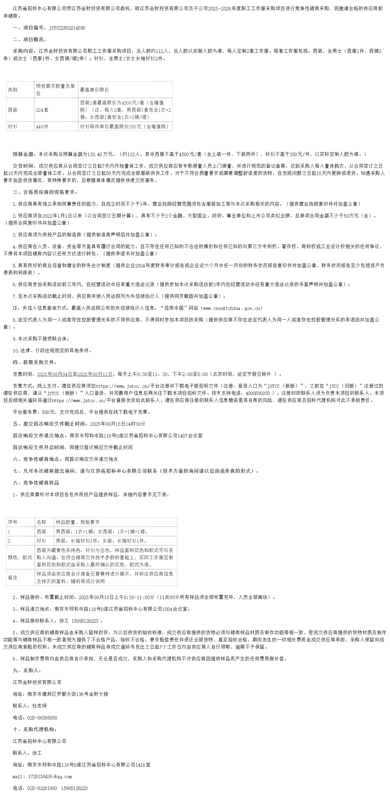 江苏省招标中心有限公司受江苏金财投资有限公司委托,就江苏金财投资有限公司及子公司*********年度职工工作服采购项目进行竞争性磋商采购,现邀请合格的供应商前来磋商。