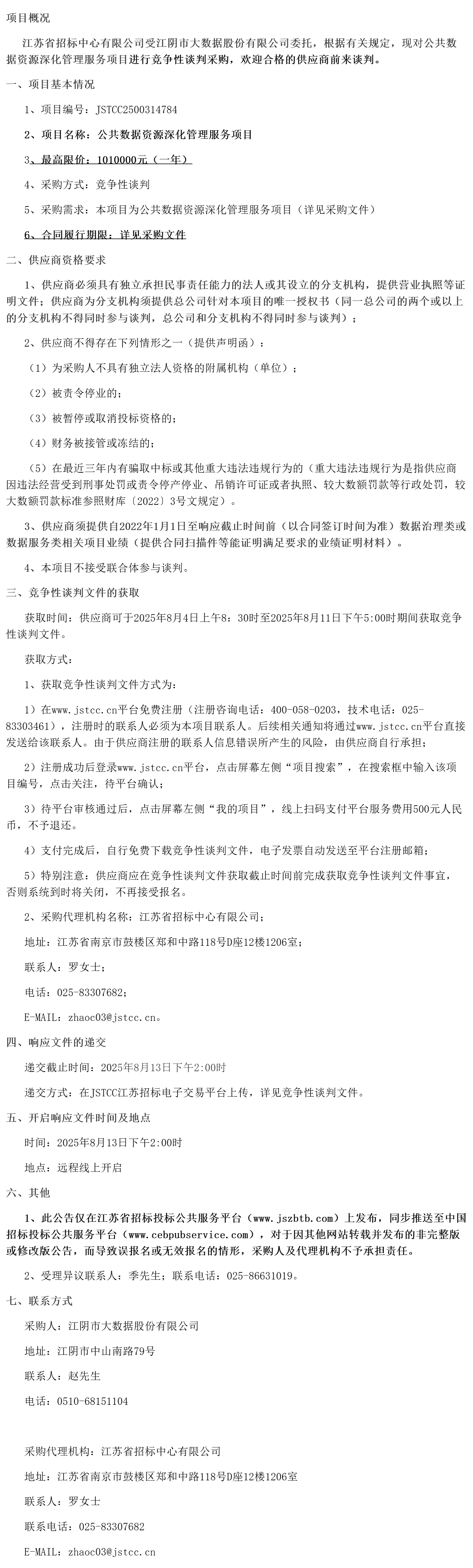 江阴市大数据股份有限公司公共数据资源深化管理服务项目竞争性谈判公告(***************)