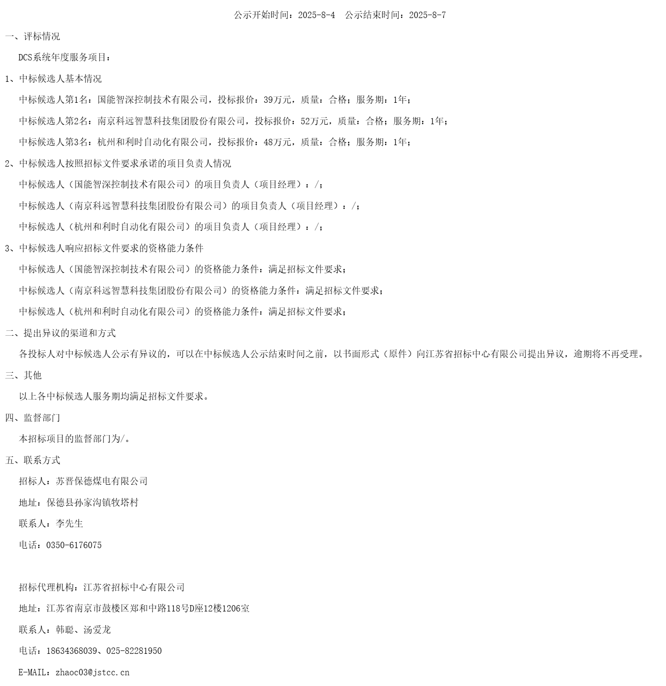 苏晋保德煤电有限公司***系统年度服务项目中标候选人公示(***************)