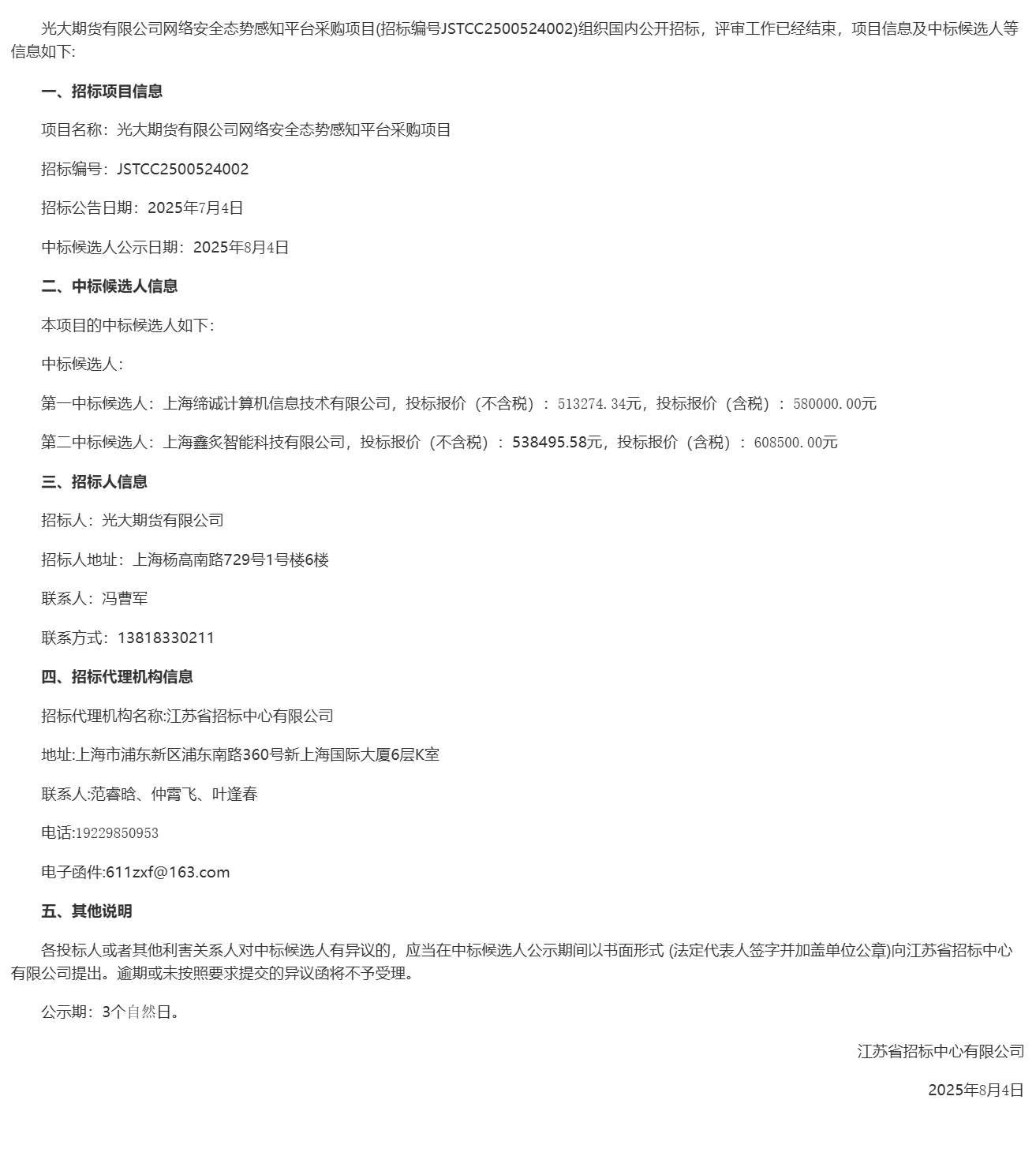 光大期货有限公司网络安全态势感知平台采购项目中标候选人公示