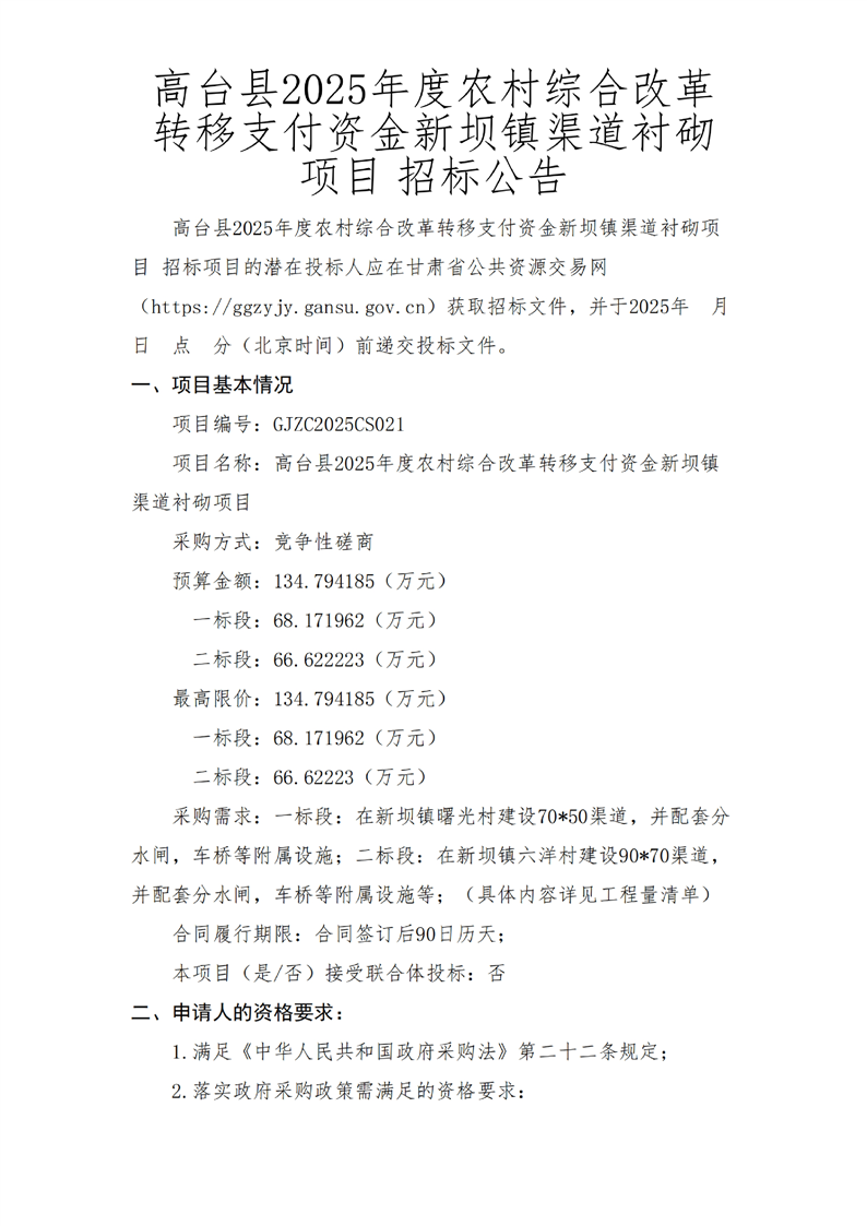 高台县2025年度农村综合改革转移支付资金新坝镇渠道衬砌项目竞争性磋商公告