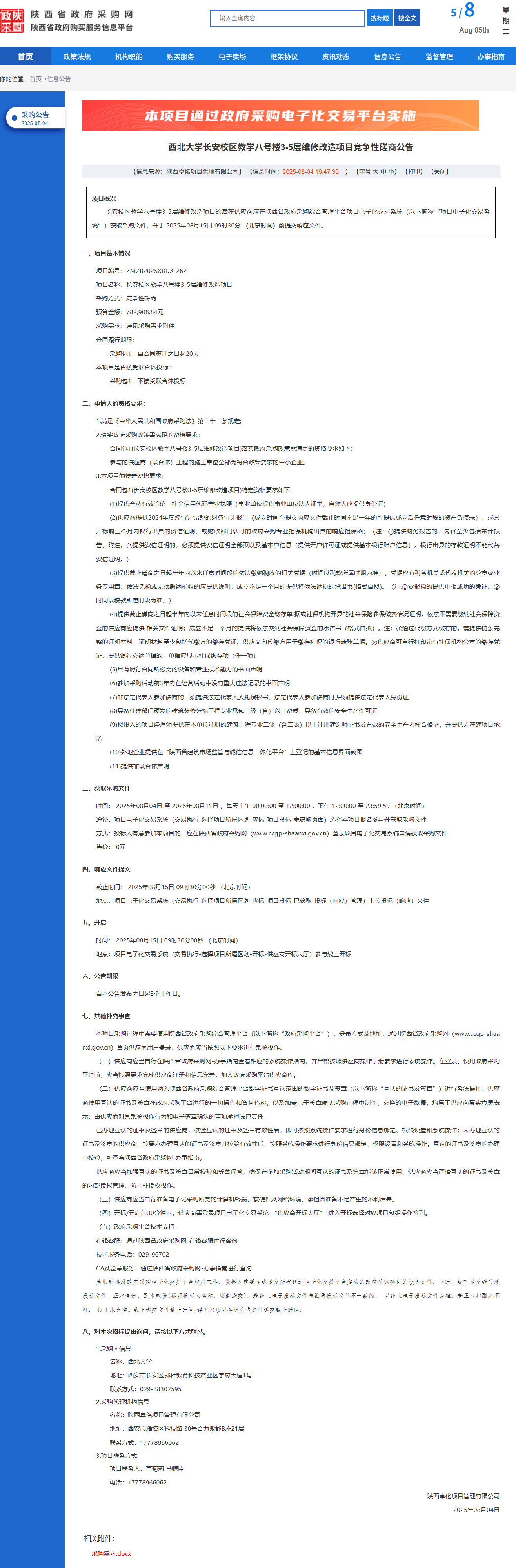 西北大学长安校区教学八号楼3-5层维修改造项目竞争性磋商公告