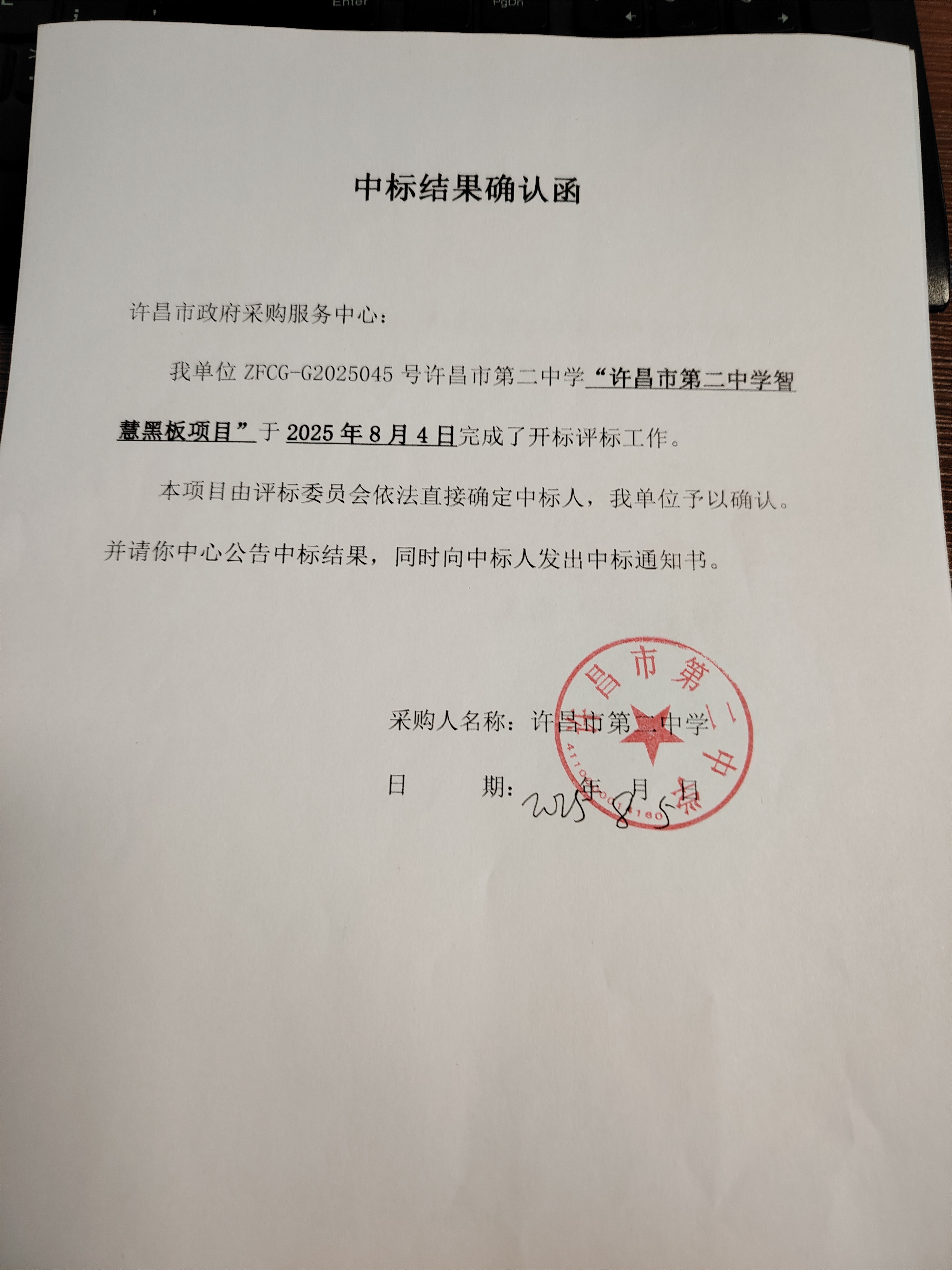ZFCG-G2025045号许昌市第二中学“许昌市第二中学智慧黑板项目”-中标公告