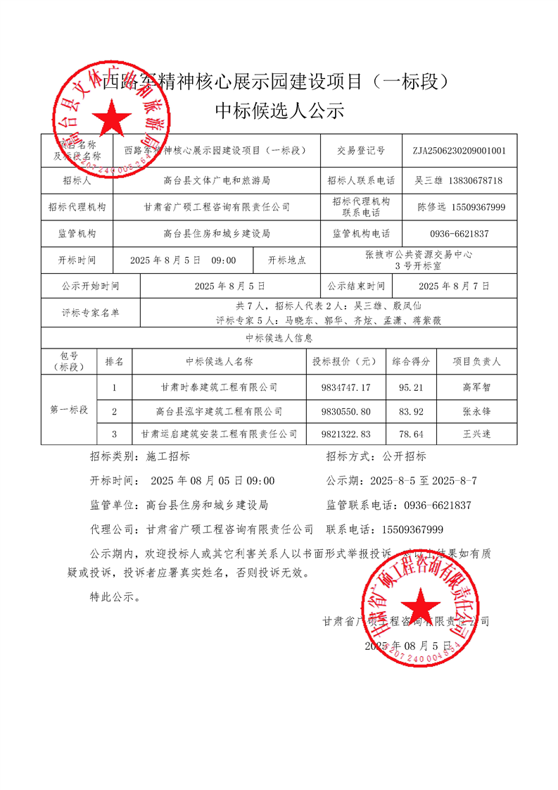 [市本级]西路军精神核心展示园建设项目(一标段)中标候选人公示交易结果公示