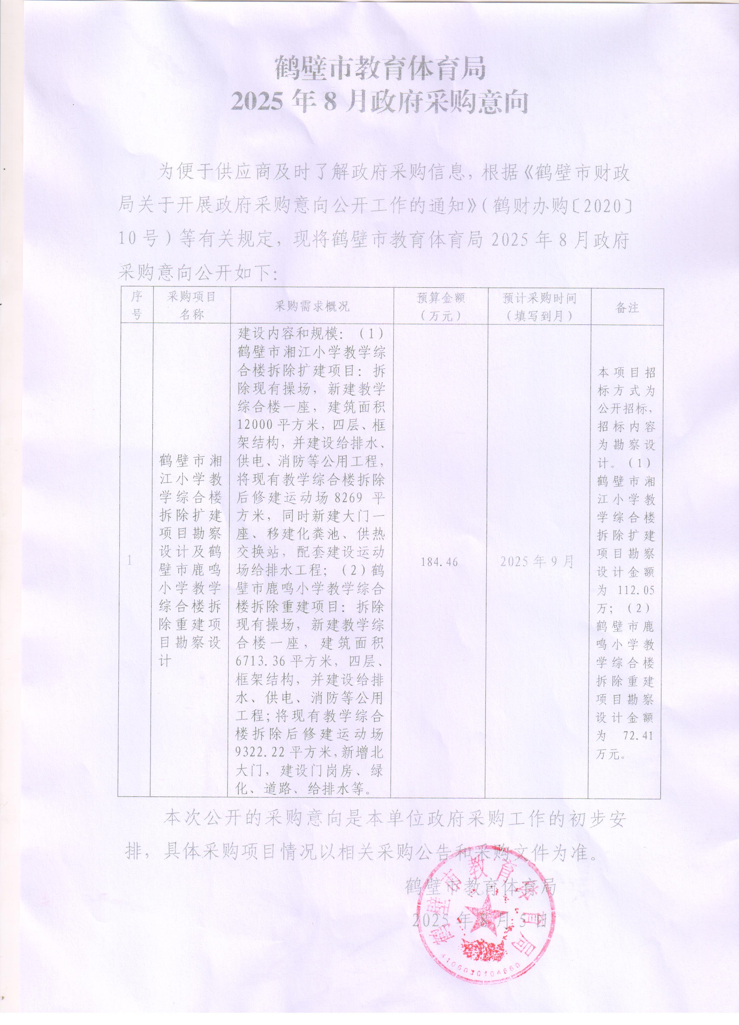鹤壁市教育体育局2025年8至9月政府采购意向